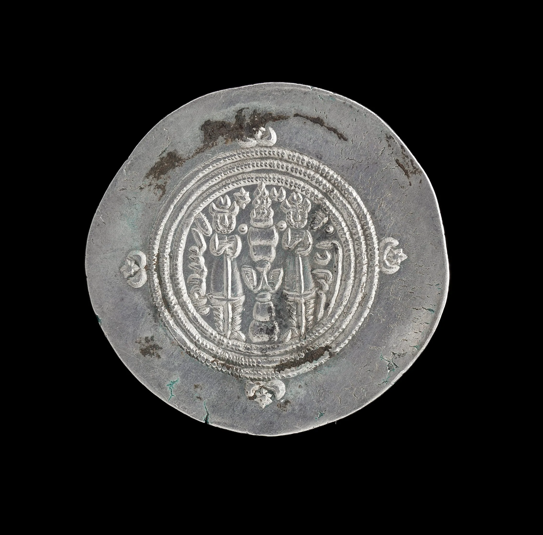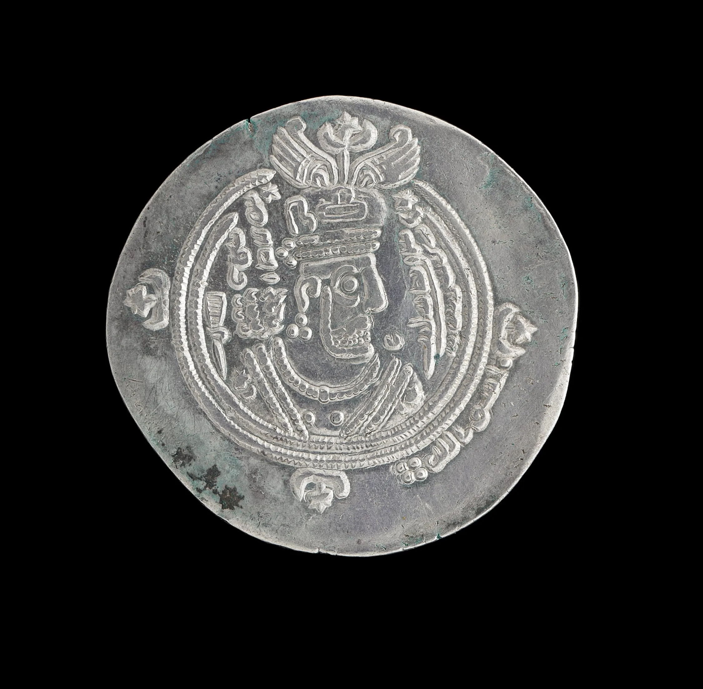 With the advent of Islam, the first Muslim rulers in the former Persian Empire continued to rely upon the coinage of the Sasanian mints, probably to prevent currency shortages and to help maintain confidence in the monetary system. This coin follows the type of silver drachm from the reign of Khusraw II (590-628). As is standard, it depicts a royal bust with characteristic winged crown on the obverse with a Pahlavi inscription at left “may his kingship increase,” and on the reverse a Zoroastrian fire temple with two attendants and in Pahlavi a mint name and date. This coin, however, was struck long after the time of Khusraw II, likely using a remade die. The Arabic text to the right of the bust
