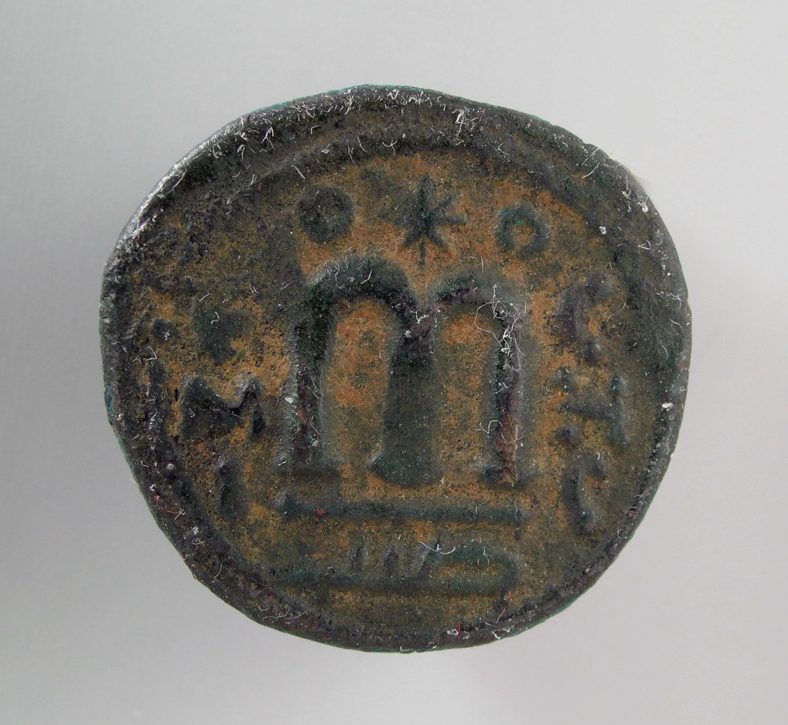Corroded bronze coin with a large raised letter M at center, small cross above, and partially legible inscriptions, viewed face-on against a gray background