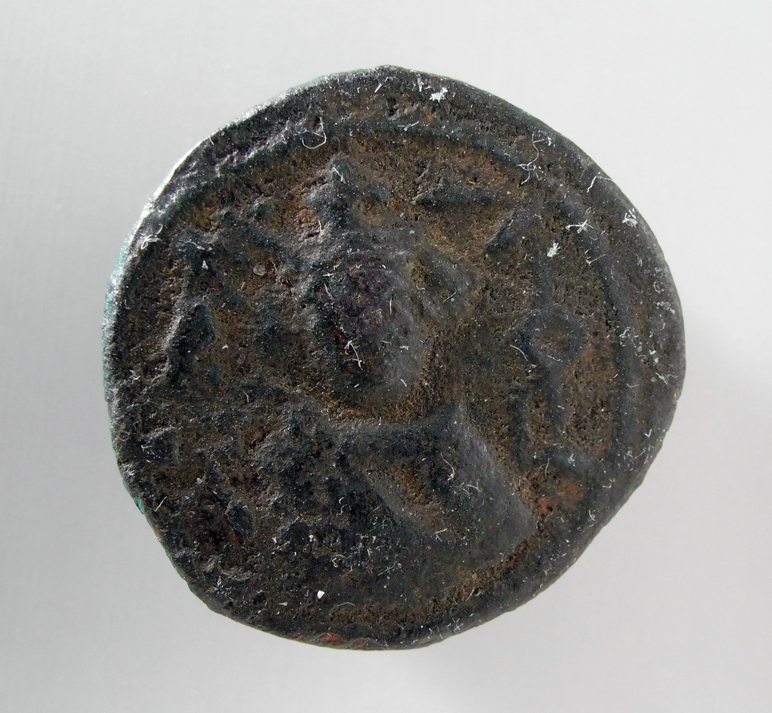 Ancient bronze coin, heavily corroded with dark brown and black patina, obverse showing a faint bust in profile with traces of worn relief detail.