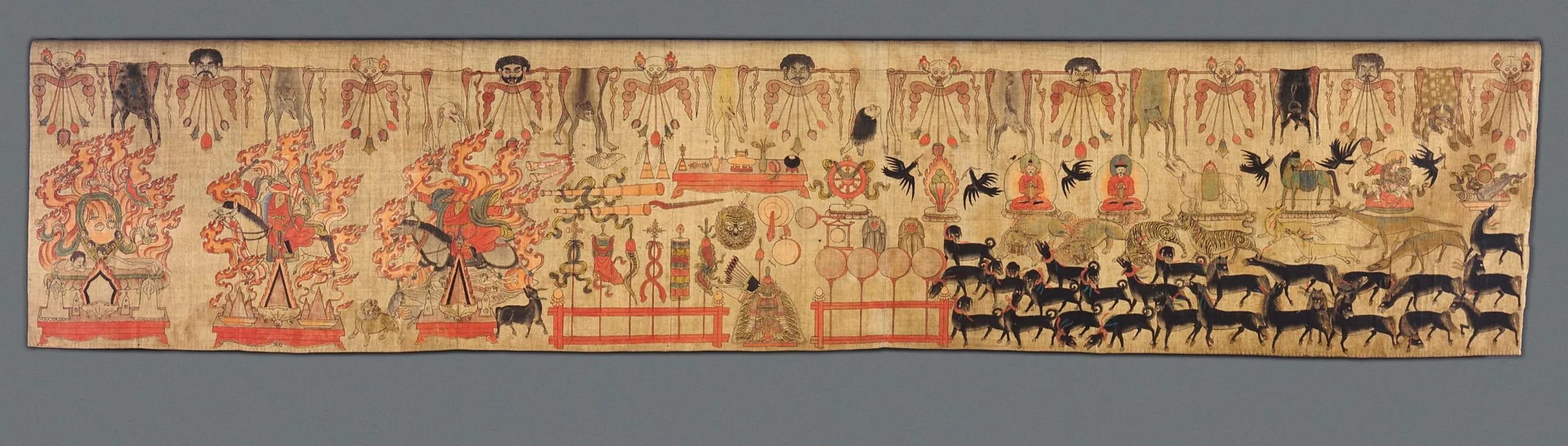 Images of offerings to the Buddhist protective deities (dharmapala) constitute a special type of Tibetan painting known as 'sets of ornaments' (gyantshog) or 'material for the banquet' (kangdze). Along the top border, festive swags of kirttimukha (‘Face of Glory’), skeleton heads, flayed skins, and entrails emphasize the destructive abilities of the dharmapala and their association with charnel grounds. Intriguingly, the protective deities that are the primary focus of worship are not physically portrayed. Rather, their divine omnipresence is represented by disembodied sets of clothing, ornaments and accompanying attributes (on viewer’s left). The sacred offerings include ritual objects (priests' bells, thunderbolts, ascetic's or tantric staffs and mirrors, water ewers and vases, and conch shells) and ritual musical instruments (drums, trumpets, hand cymbals, and a lute). The seven precious possessions of the Universal Monarch (chakravartin) are also depicted: the wheel, elephant, horse, jewel, queen, chief minister and general of the army. The esoteric ensemble includes a host of wild animals to be ritually presented to the protective deities, such as horses, snow lions, tigers, jackals, crows, and monkeys. Many offerings paintings also include Mount Meru, which is both the physical axis mundi of Buddhist cosmology and the metaphysical landscape of meditative transformation that lies in the 'heart-mind' of each Vajrayana Buddhist practitioner. See also M.81.211 and M.81.8.5.