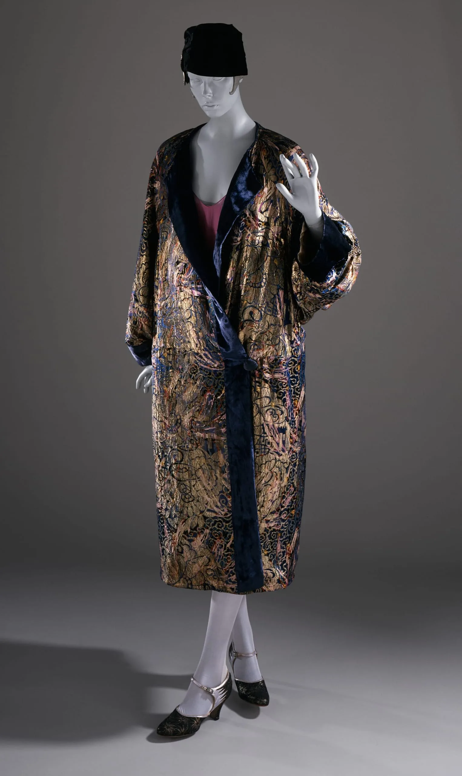- Silk satin, printed, with metallic weft float patterning bound in twill, with silk velvet and silk satin covered button