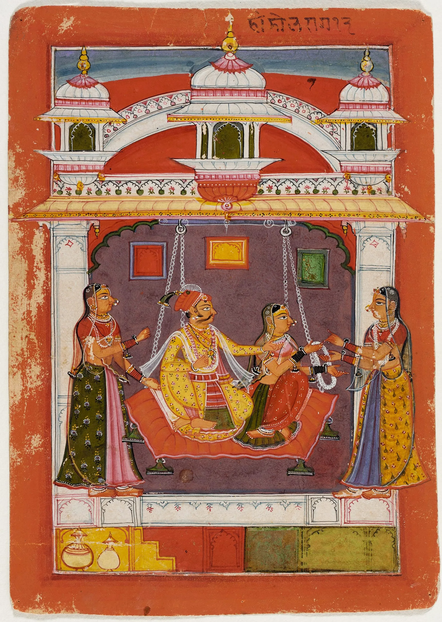 Here, a mustachioed lord and his consort are seated on a swing suspended from the porch ceiling of an elaborate palace. They are receiving a floral garland from a female attendant. A second female attendant offers pan (betelnut quids) and may be pushing the swing. Dark storm clouds fill the sky.