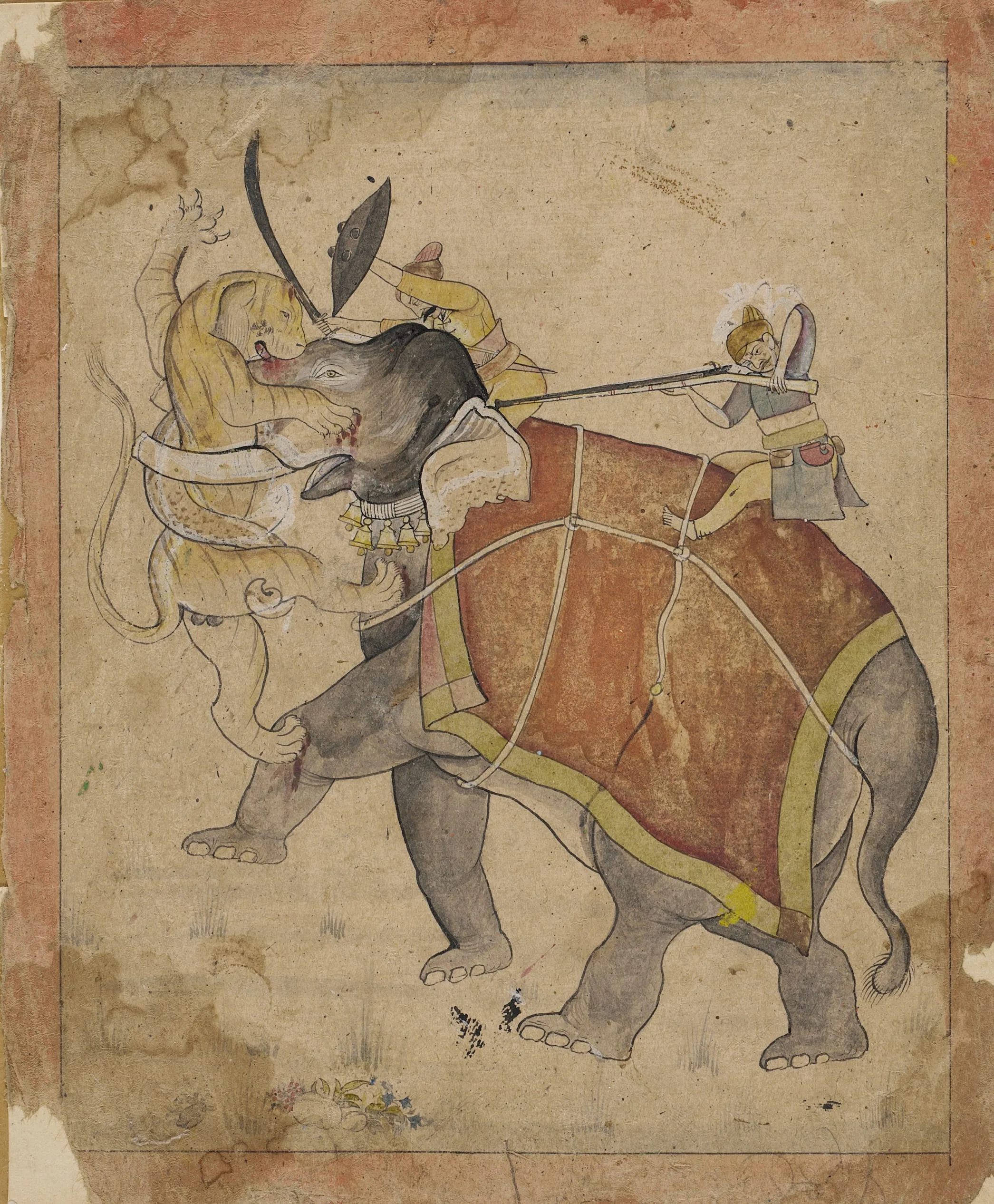 In this powerful representation, a tiger is fiercely clawing and biting an elephant that has grabbed the tiger with its trunk and lifted it off the ground. The driver is striking the tiger with a sword while protecting himself with a shield. A second rider, holding onto the elephant by hooking his feet under the harness ropes, fires a rifle at the enraged beast. He wears a powder primer flask and a flint pouch suspended from his waist sash. Interestingly, the artist has altered the composition in a few areas by whiting out some minor elements and redrawing them.