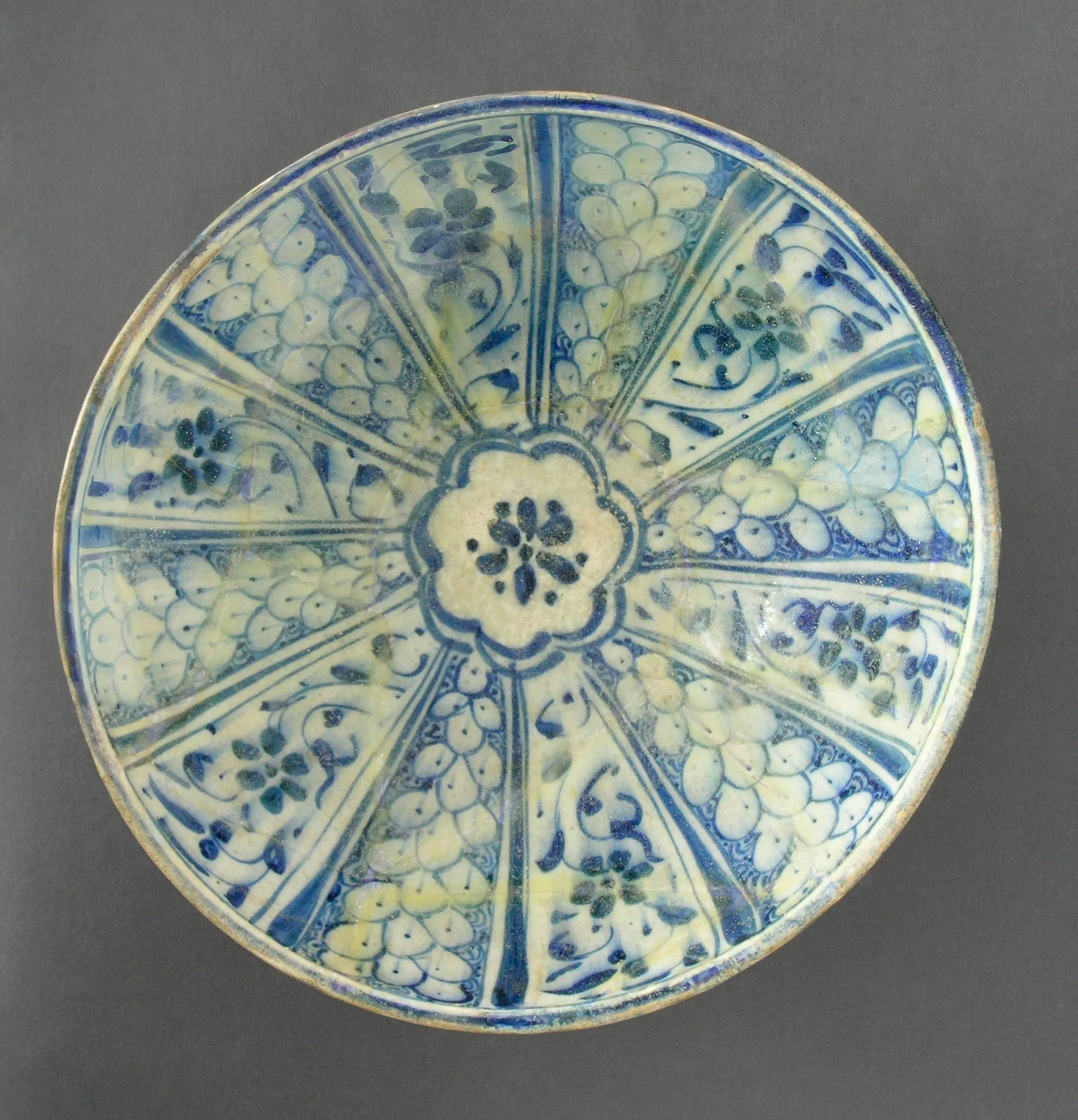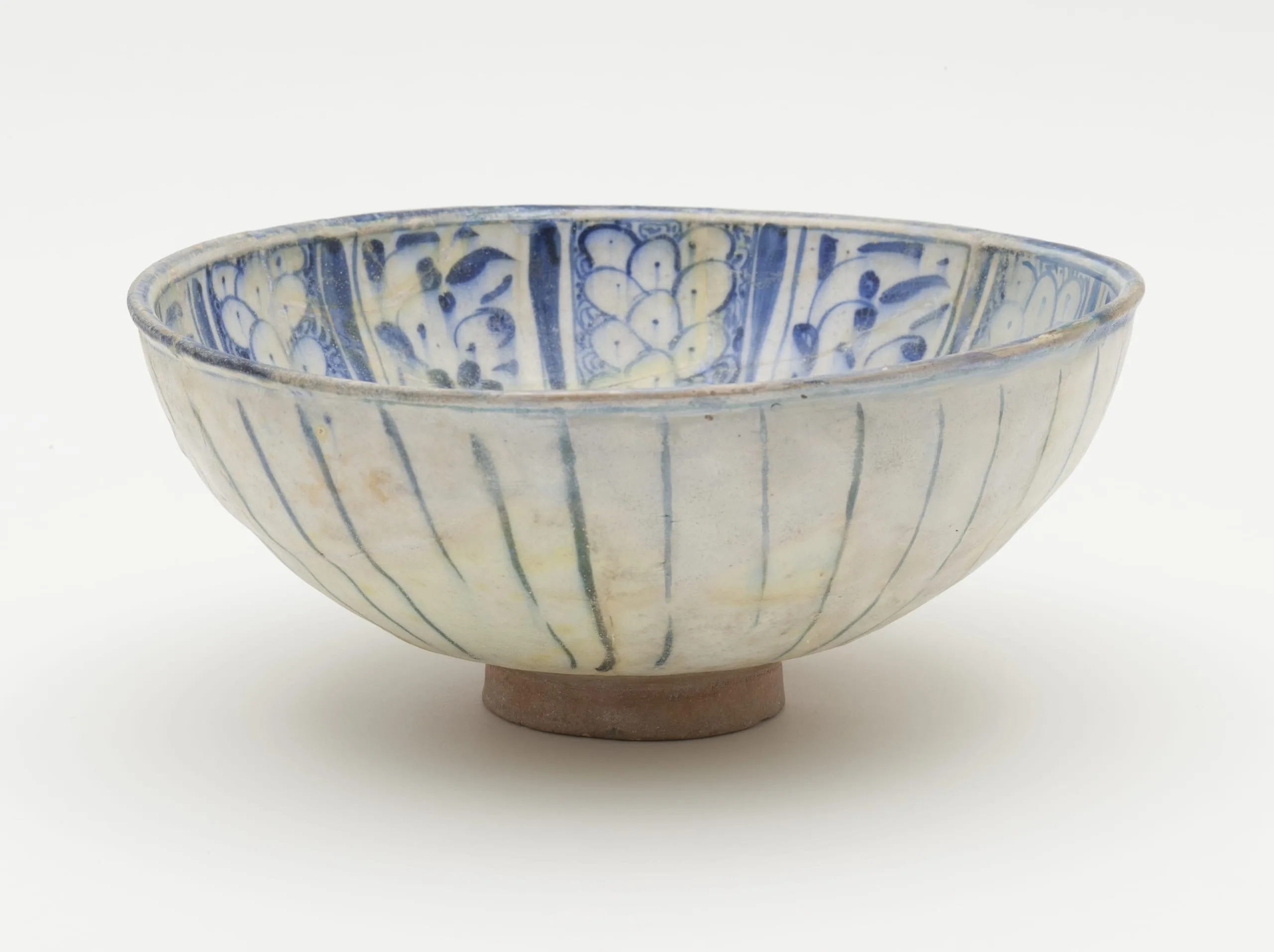 This is one of three nearly identical bowls in LACMA’s collection, something of a rarity in Islamic ceramics, indicating that they were made in the same potter’s workshop and suggesting that they may have been intended as part of a matched set (see M.2002.1.52 and M.2002.1.67). They were likely produced under the Mamluk dynasty, which ruled Egypt and Syria from 1250 to 1517. Their blue and white color scheme and scrolling leaf and floral designs are typical of late Mamluk ceramics, both tableware and architectural revetment (see M.2002.1.50).