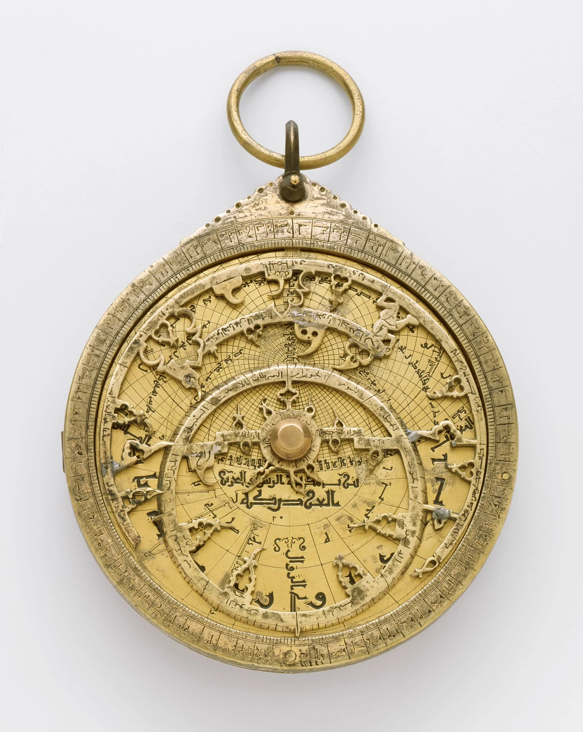 The astrolabe is an astronomical device that Muslims inherited from the Hellenistic world and then passed on to medieval Europe. According to its inscriptions, this handsome gilt brass astrolabe was made in Seville, in southern Spain; exceptionally, it seems to have been altered nearly seventy years after it was made, possibly in Egypt or Syria. Like all such instruments, it was designed to measure the altitude of the stars, sun, or moon and to establish different astronomical and topographic associations without resorting to calculations or formulas; it was especially valuable in a religious context, as the Muslim times of prayer are astronomically determined.