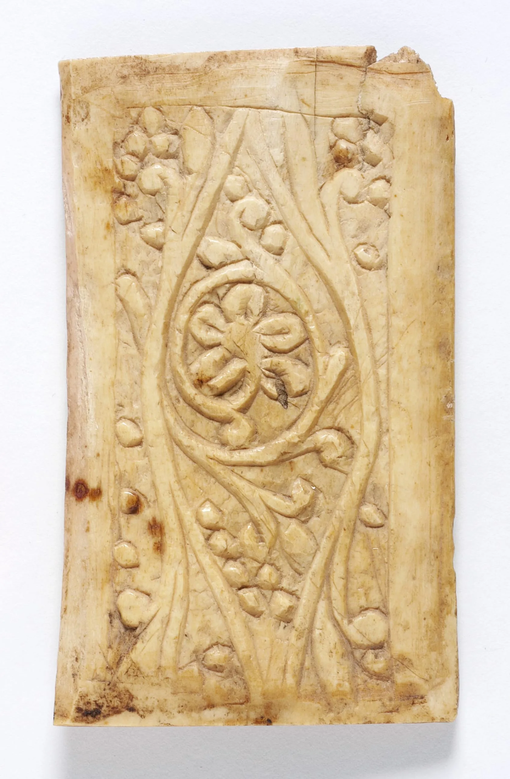 The Late Antique desire for luxury objects carved from ivory or bone carried on after the Muslim conquest, and this small bone plaque is one example of the continuing craft. Ivory and bone were used to make containers, frames, and other portable objects, but a smaller carved piece like this one may have been used as embellishment on furniture or a box. Its subtle single-level relief carving and trefoil vine decoration are typical of the early Islamic period in Egypt, where artisans continued to ply their craft but perhaps for new Muslim patrons.