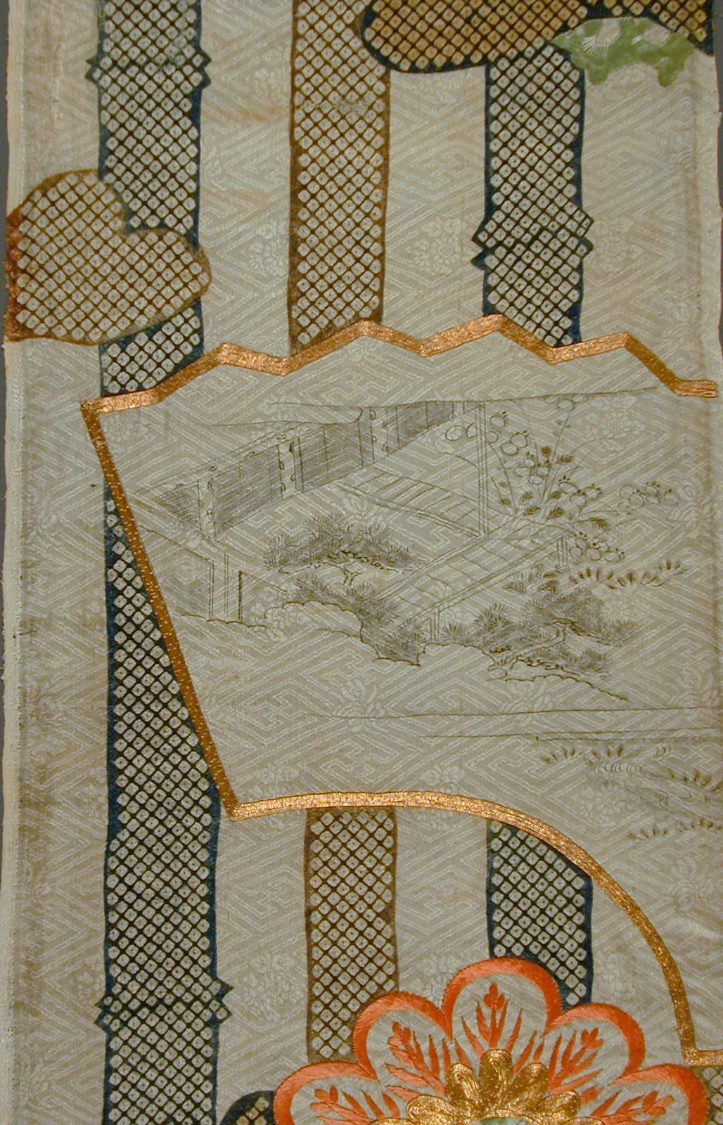 - Silk figured satin (rinzu), stenciled imitation tie-dyed (kata kanoko shibori), with silk- and gilt-paper-wrapped-silk-thread embroidery, hand-painted ink (kaki-e)