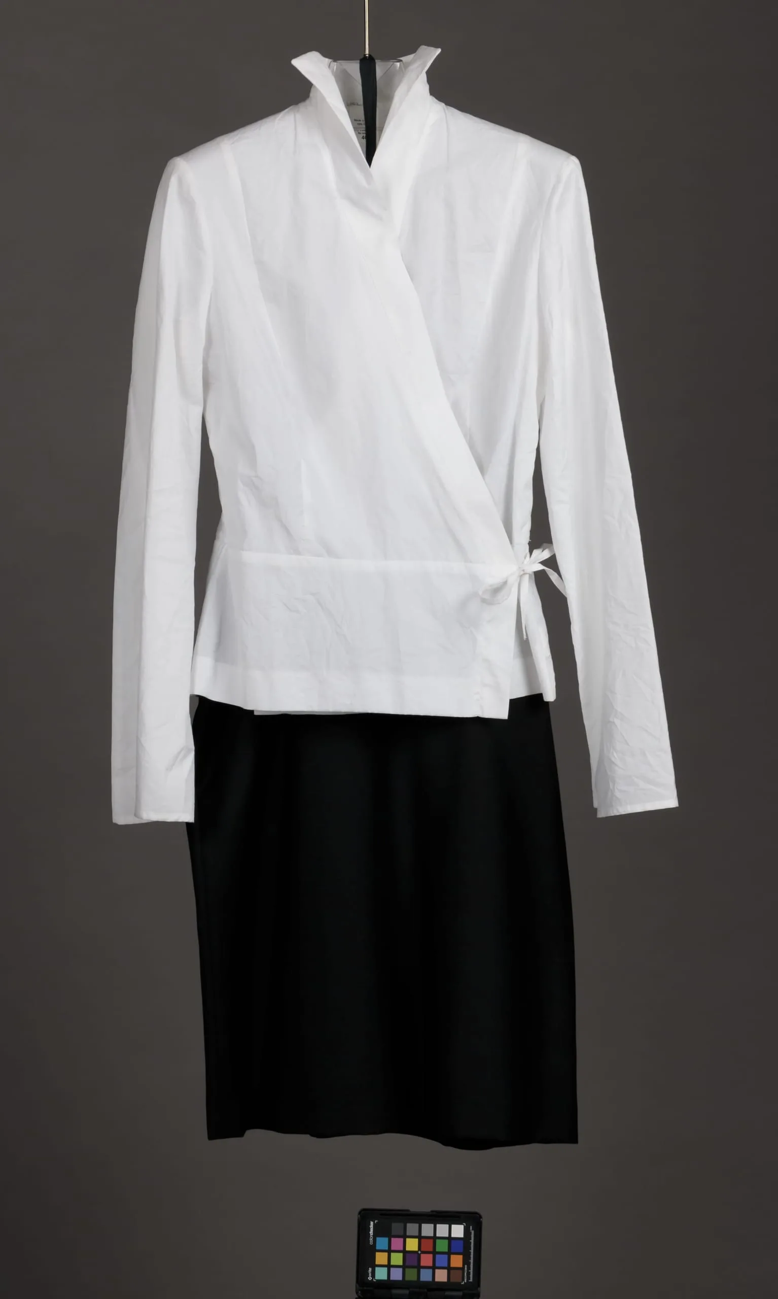 - Blouse: cotton plain weave; Skirt: wool twill.
