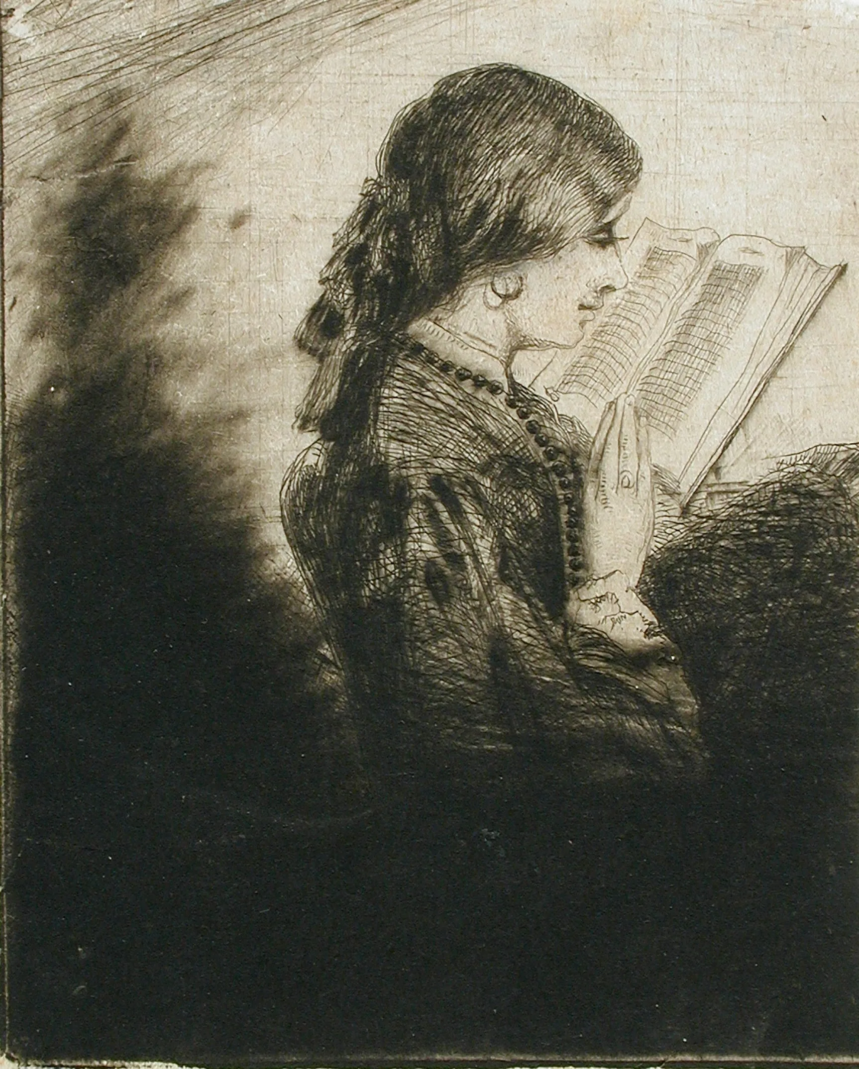 Etching of a young woman in profile reading an open book, with dense black crosshatching on the left and fine lines defining her braided hair and dark dress