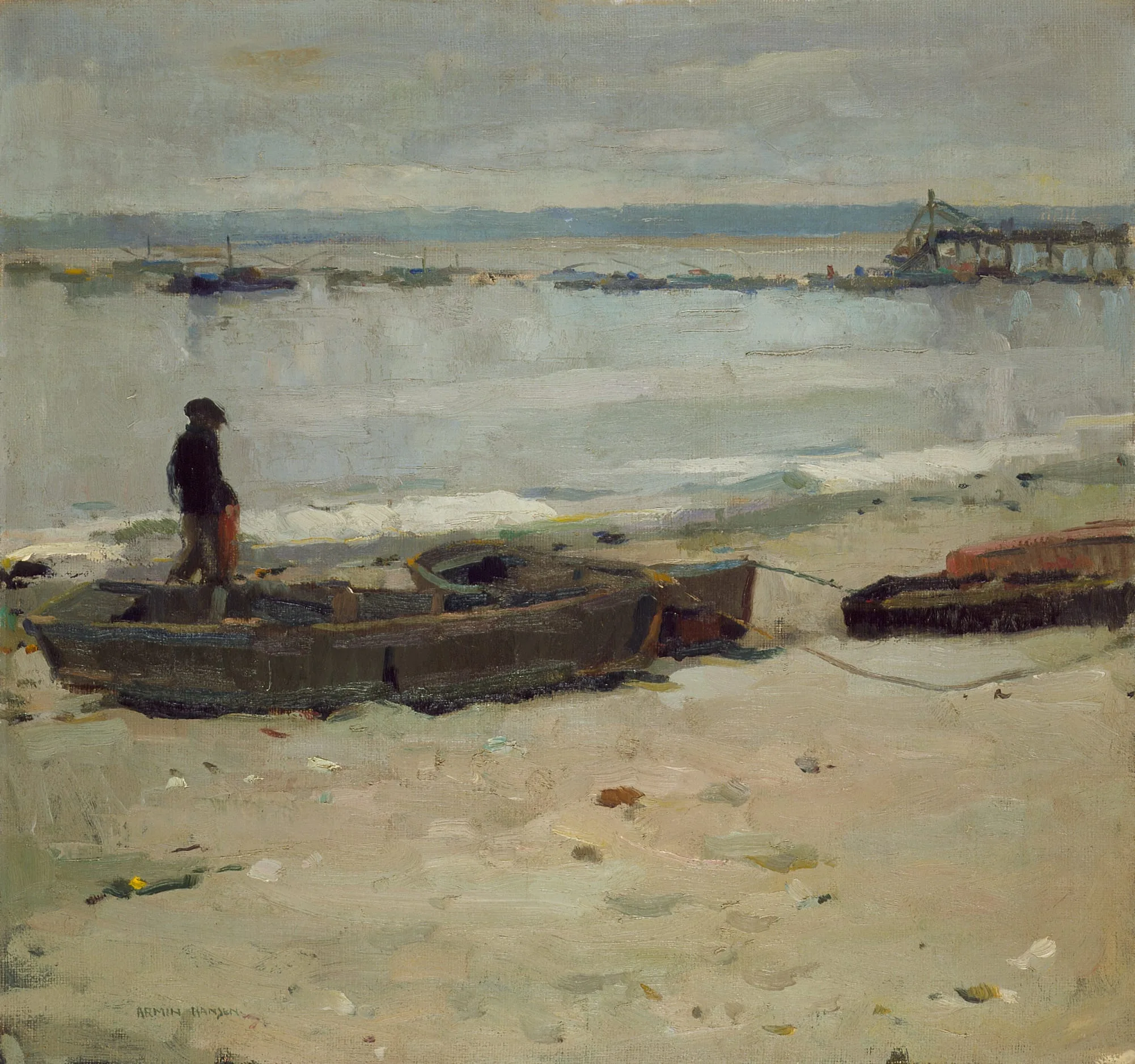 Despite the title, Boy with a Cod is not one of Hansen’s typical genre scenes of fishermen in which large figures dominated. The boy is small in scale and the cod not easily discernible. The painting is a seascape in which the figure of a boy merely serves to direct the viewer’s gaze beyond the boats into the wide expanse of ocean and sky. Hansen was best known for his dramatic, stormy marines, but, as Boy with a Cod demonstrates, he was equally skilled in capturing the more delicate and serene aspects of nature. The soft, grayish tones of blue and green are characteristic of the palette he established early on, and such color symphonies enabled the artist to capture the atmospheric conditions and mood of the coast on a cold afternoon. His practice of posing the figure in the open air no doubt encouraged the direct, fresh brushwork.
