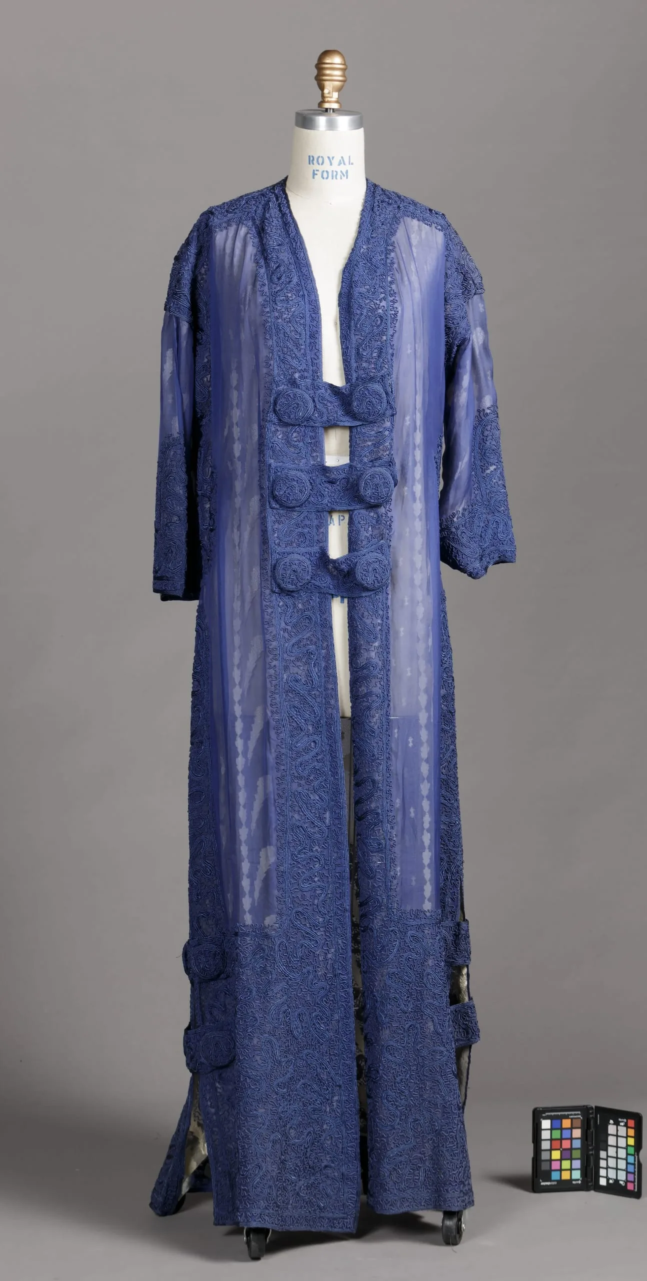 - Silk plain weave (chiffon) with silk braid and silk cord embroidery and buttons and silk plain weave (chiffon) with silk supplementary-weft patterning