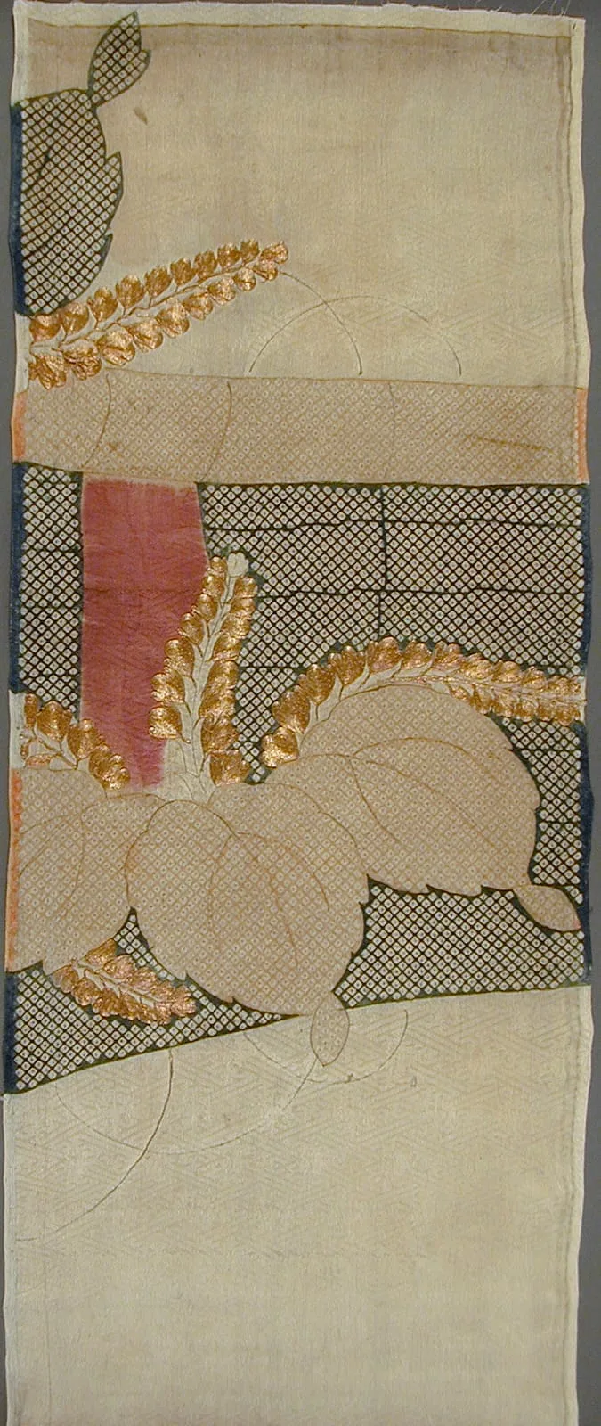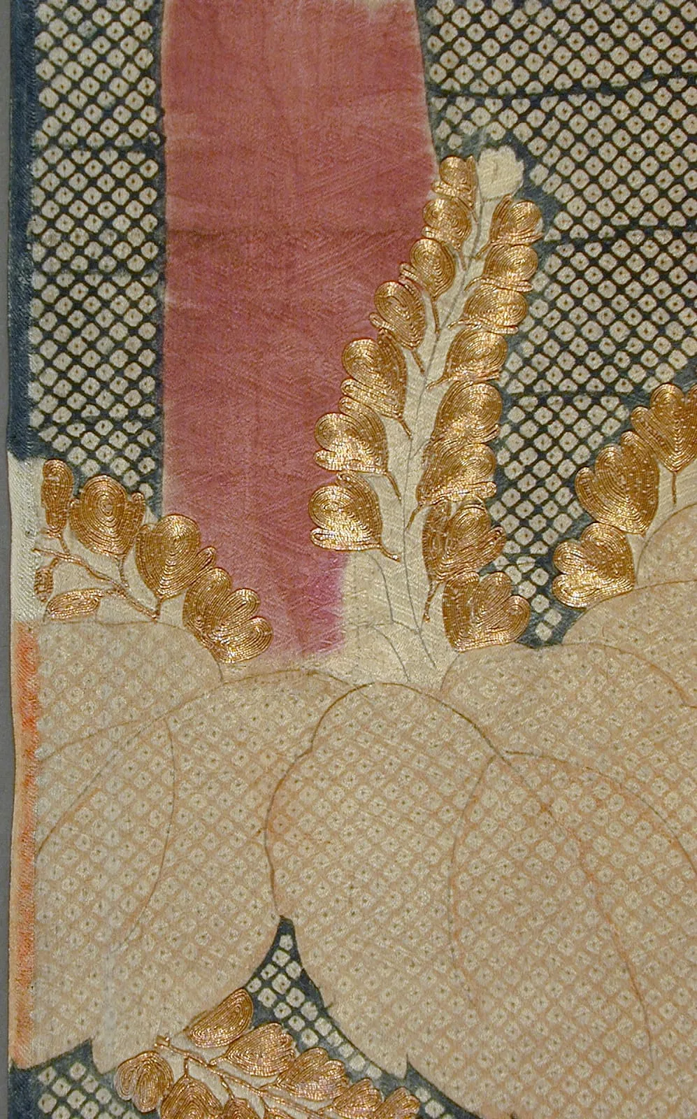 - Silk figured satin (rinzu), stenciled imitation tie-dye (kata kanoko shibori), stitch resist (muishime shibori) with gilt paper wrapped silk thread embroidery