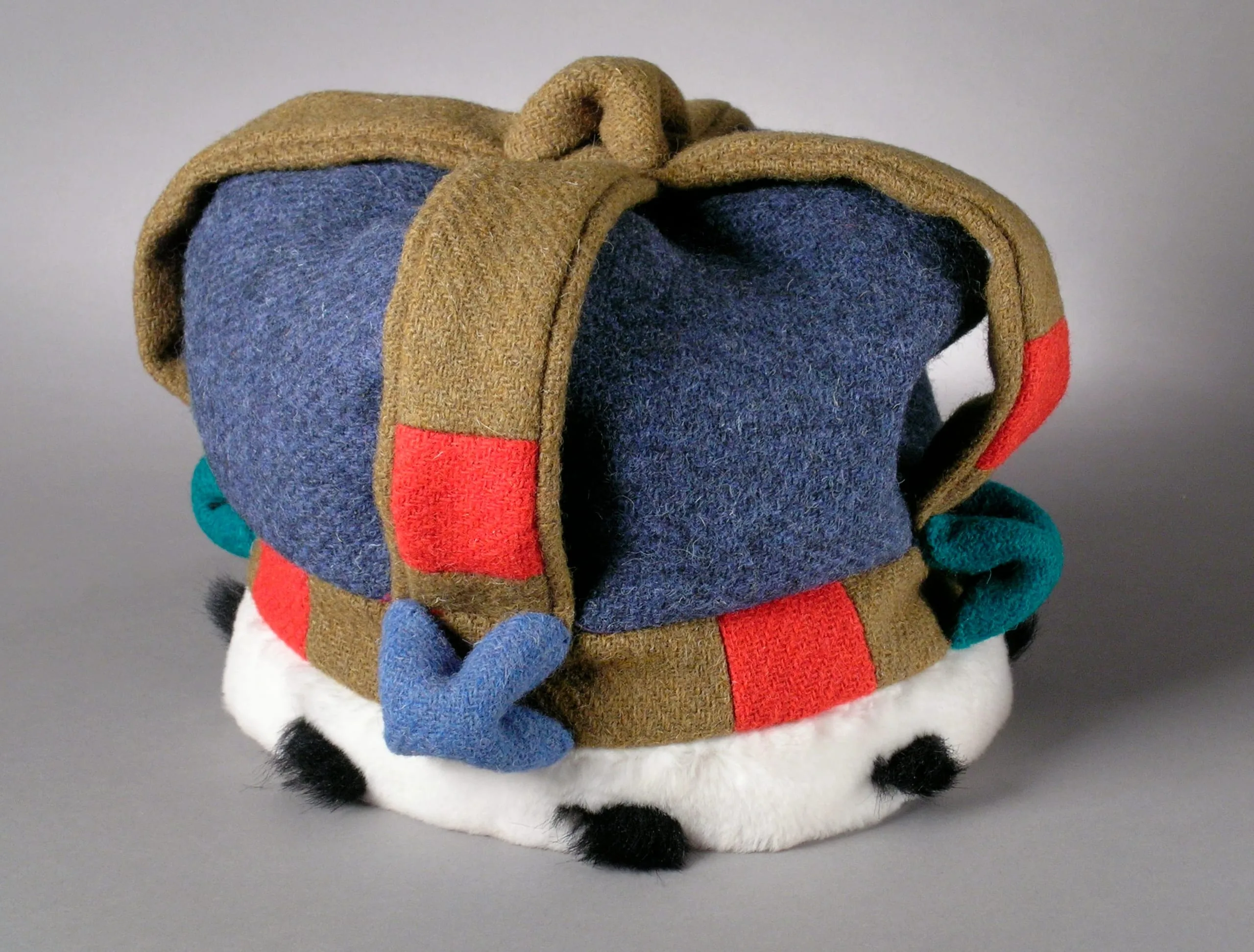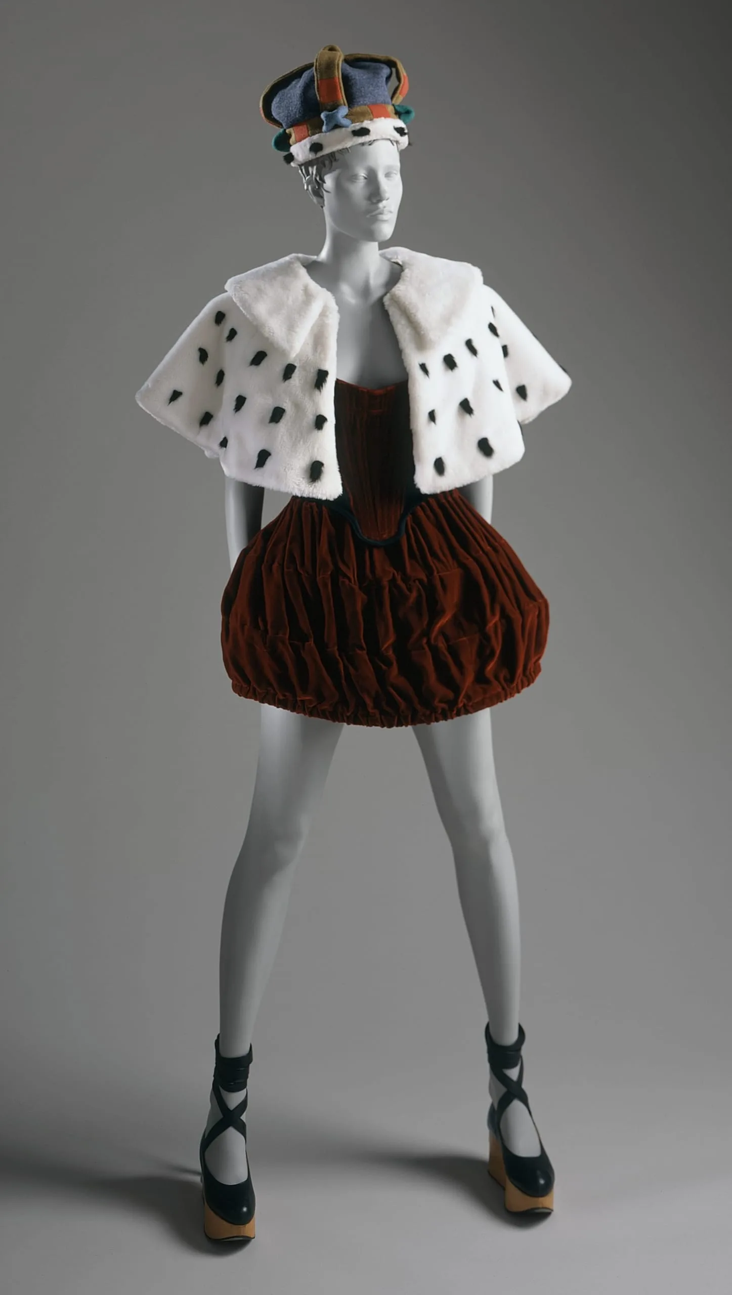 - Hat: Wool twill and synthetic fur; Cape: Synthetic fur and silk satin ribbon; Corset: Silk velvet and coton knit (jersey); Skirt: Silk velvet; Shoes: Leather and wood