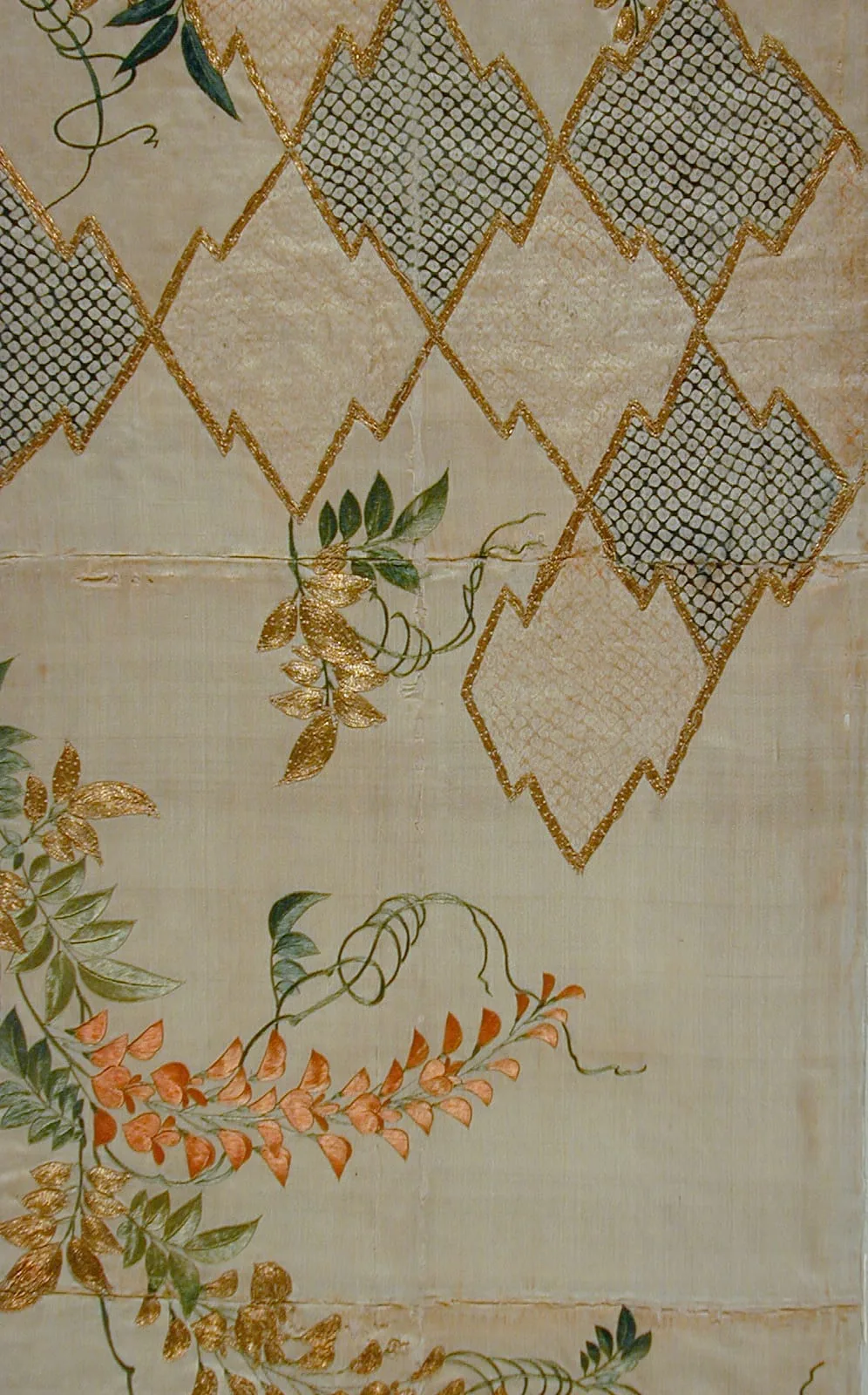 - Silk satin (shusu), stenciled imitation tie-dyed (kata kanoko shibori) with silk and gilt paper wrapped silk thread embroidery
