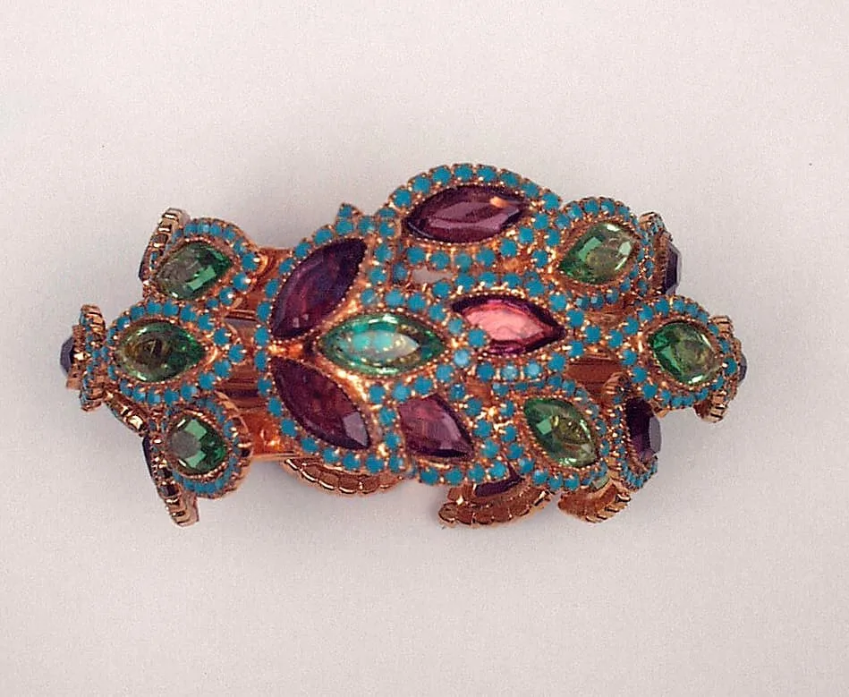 - Crystal faux amethyst and peridot, glass faux turquoise, 18 kt gold-electroplated brass