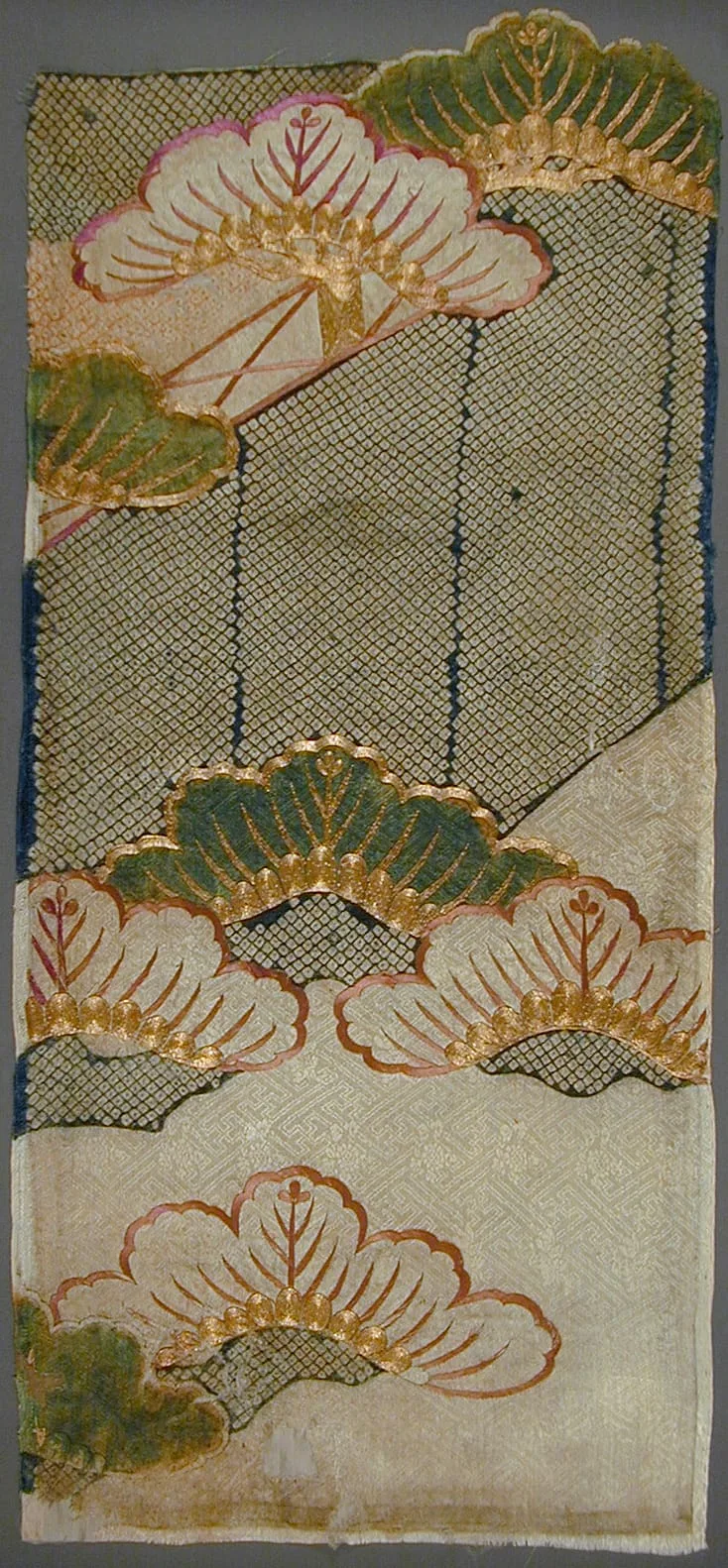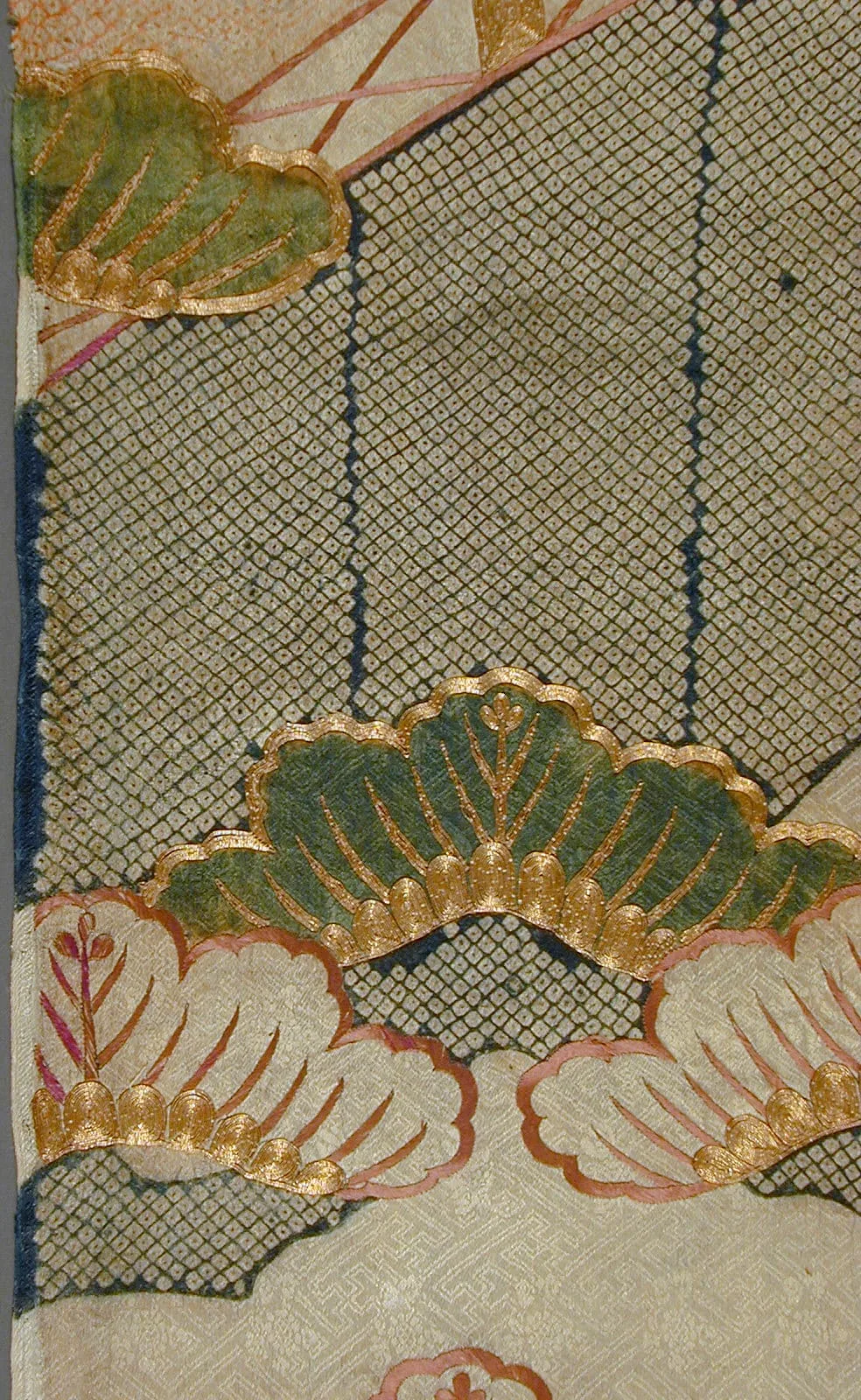 - Silk figured satin (rinzu), tie-dyed (kanoko shibori and boshi shibori) silk and gilt paper wrapped silk thread embroidery
