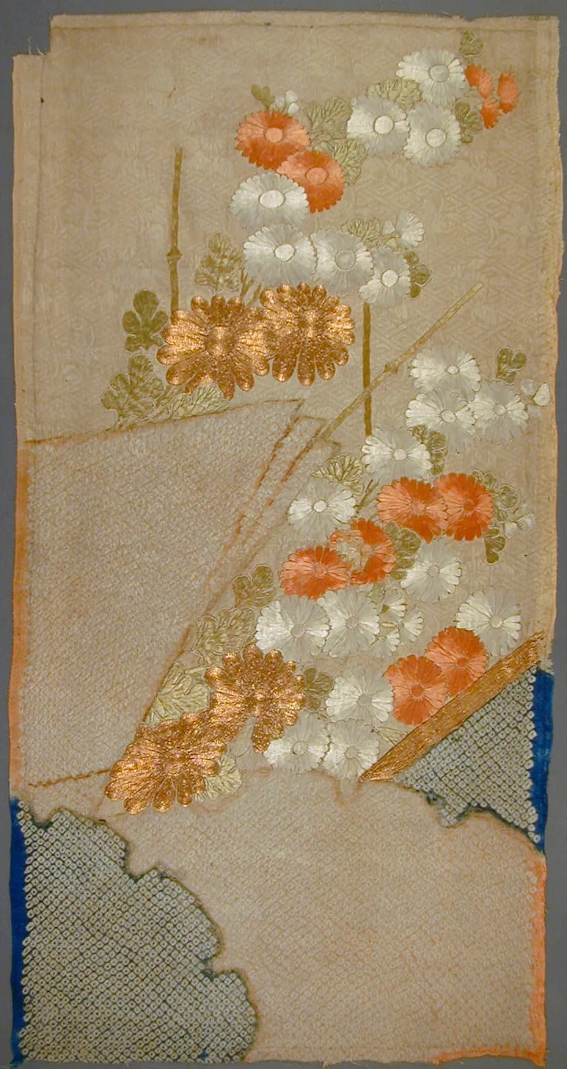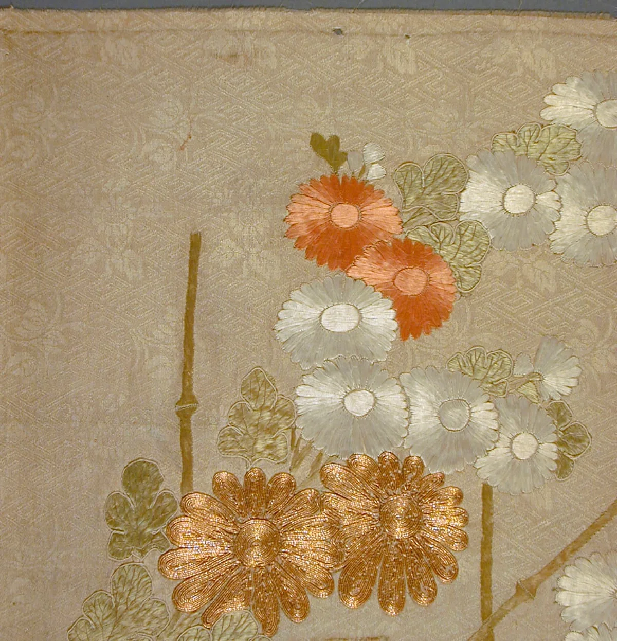 - Silk figured satin (rinzu), tie-dyed (kanoko shibori), silk and gilt-paper wrapped silk embroidery