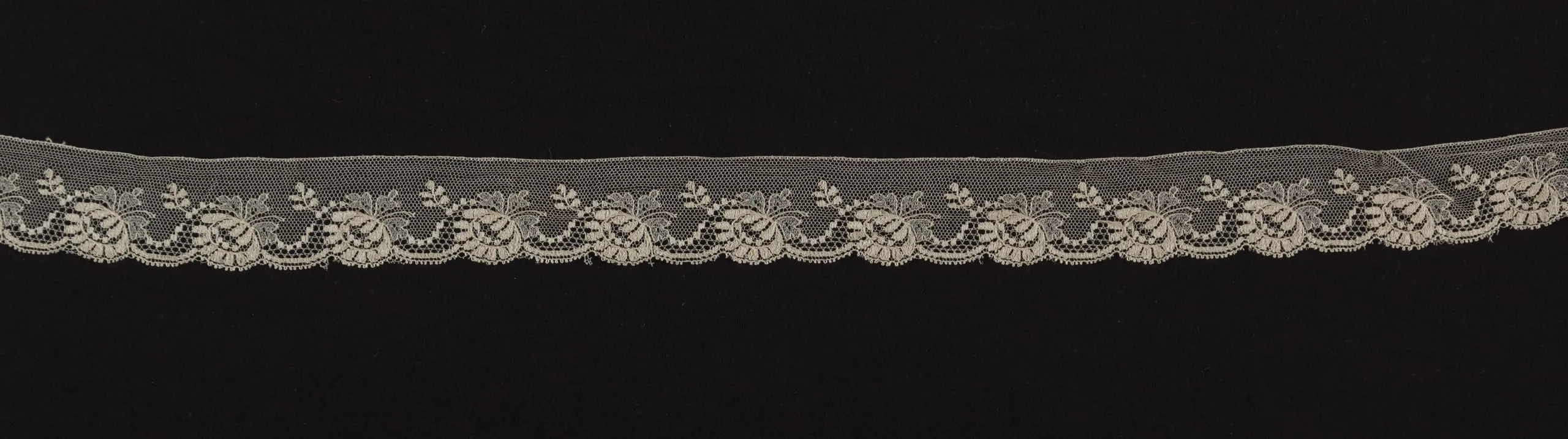 Narrow strip of ivory machine-made lace with repeating floral and leaf motifs on a sheer net ground, scalloped lower edge, against a black background