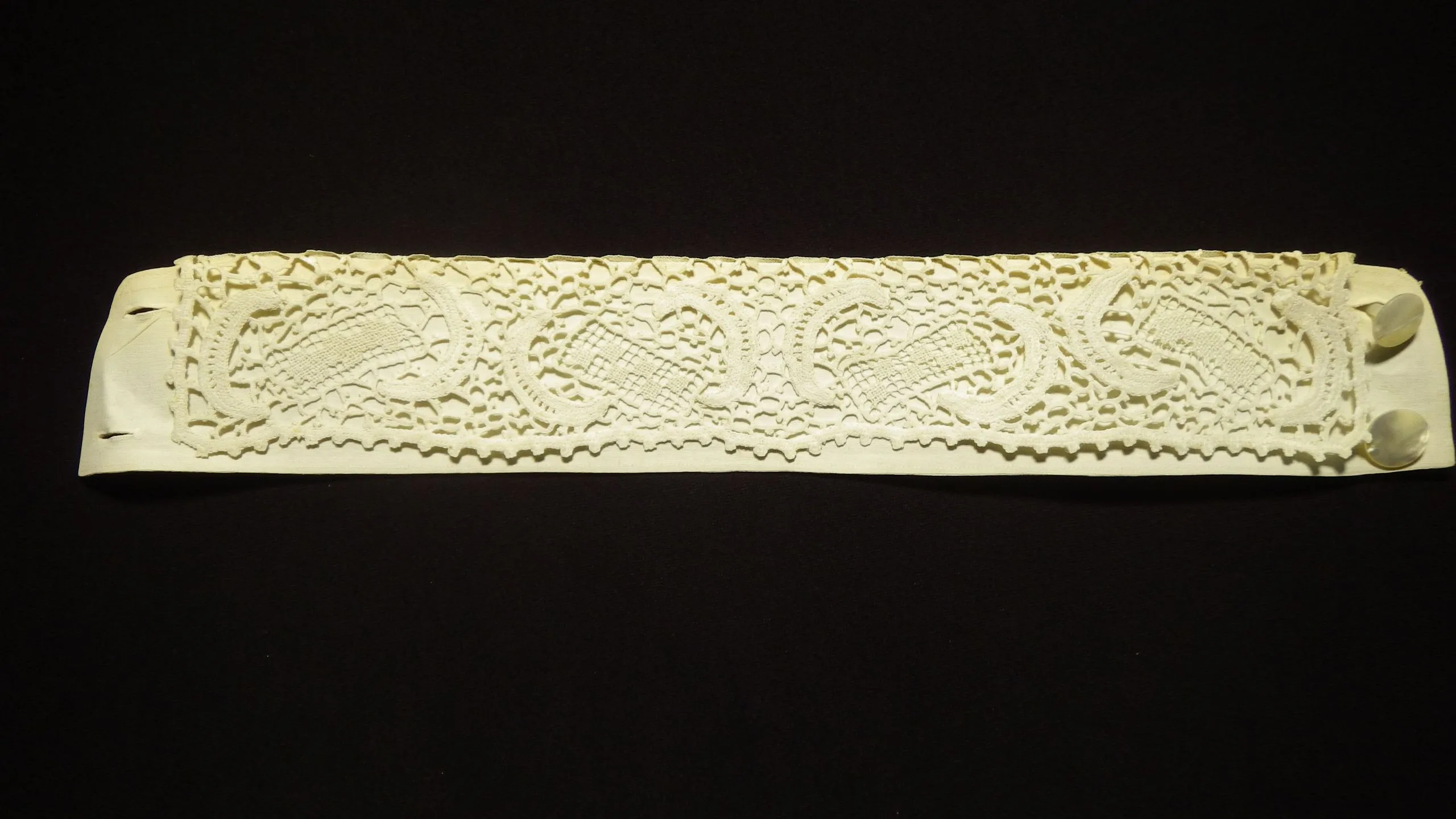 - Cotton plain weave, cotton crochet, cotton hand-knotted lacis, mother-of-pearl buttons
