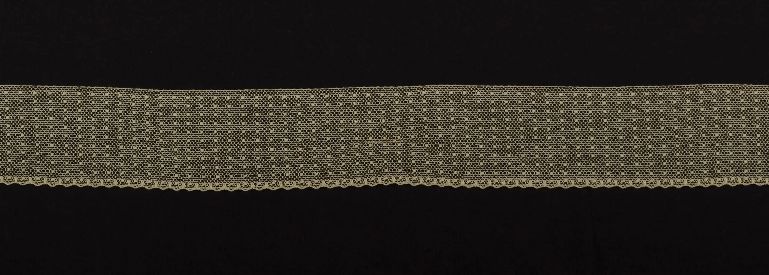 Narrow horizontal strip of ivory-yellow lace with a diamond net ground, allover dot pattern, and scalloped lower border, displayed against a black background