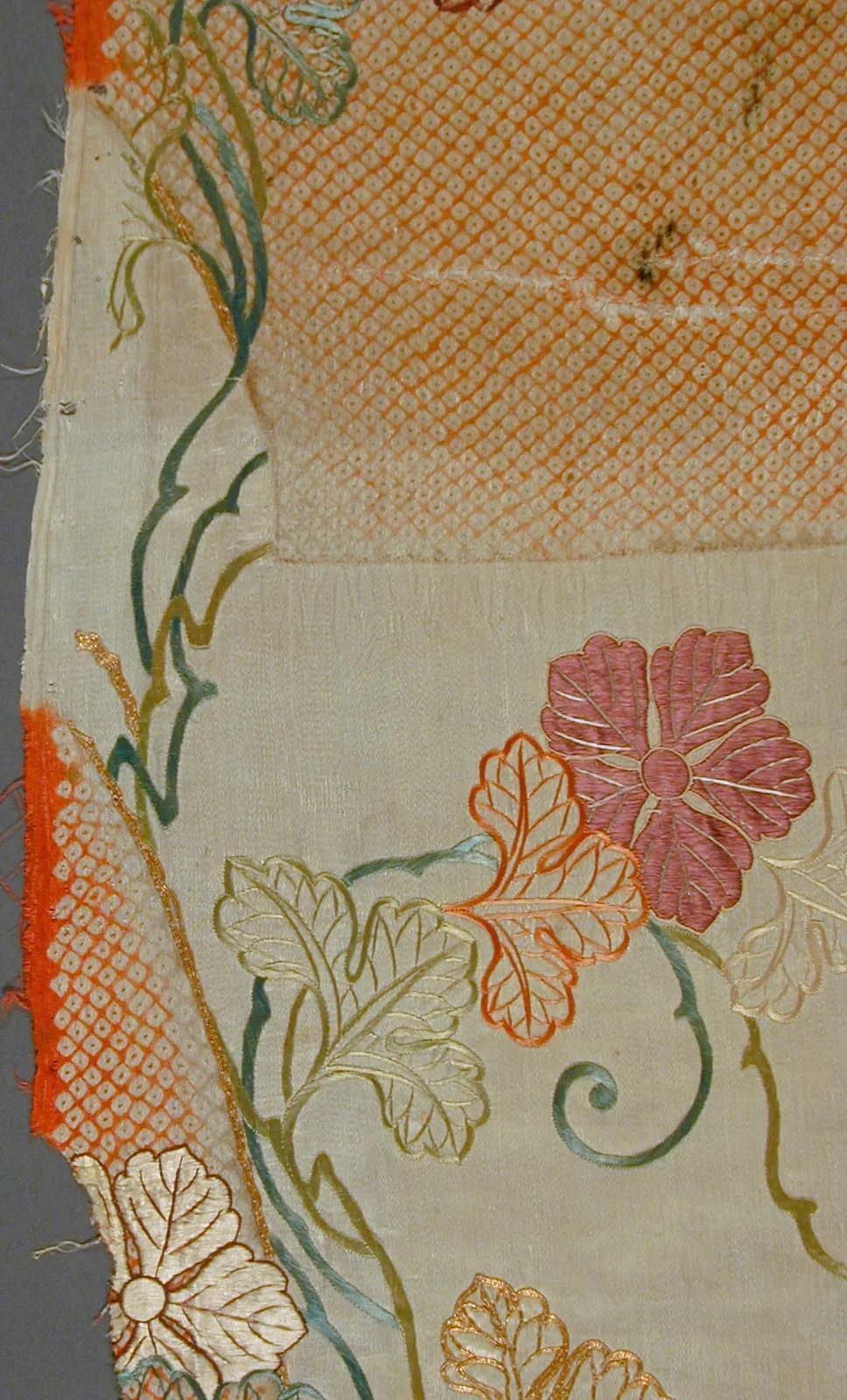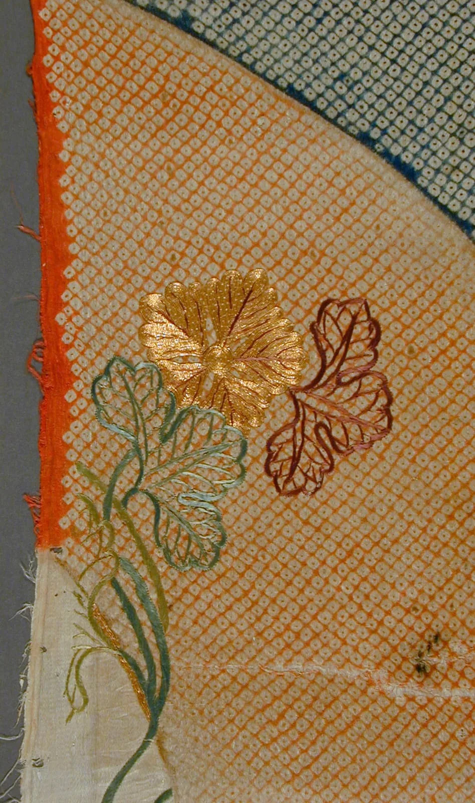 - Silk satin with tie-resist dye (kanoko shibori) and silk and gilt-papper wrapped silk embroidery