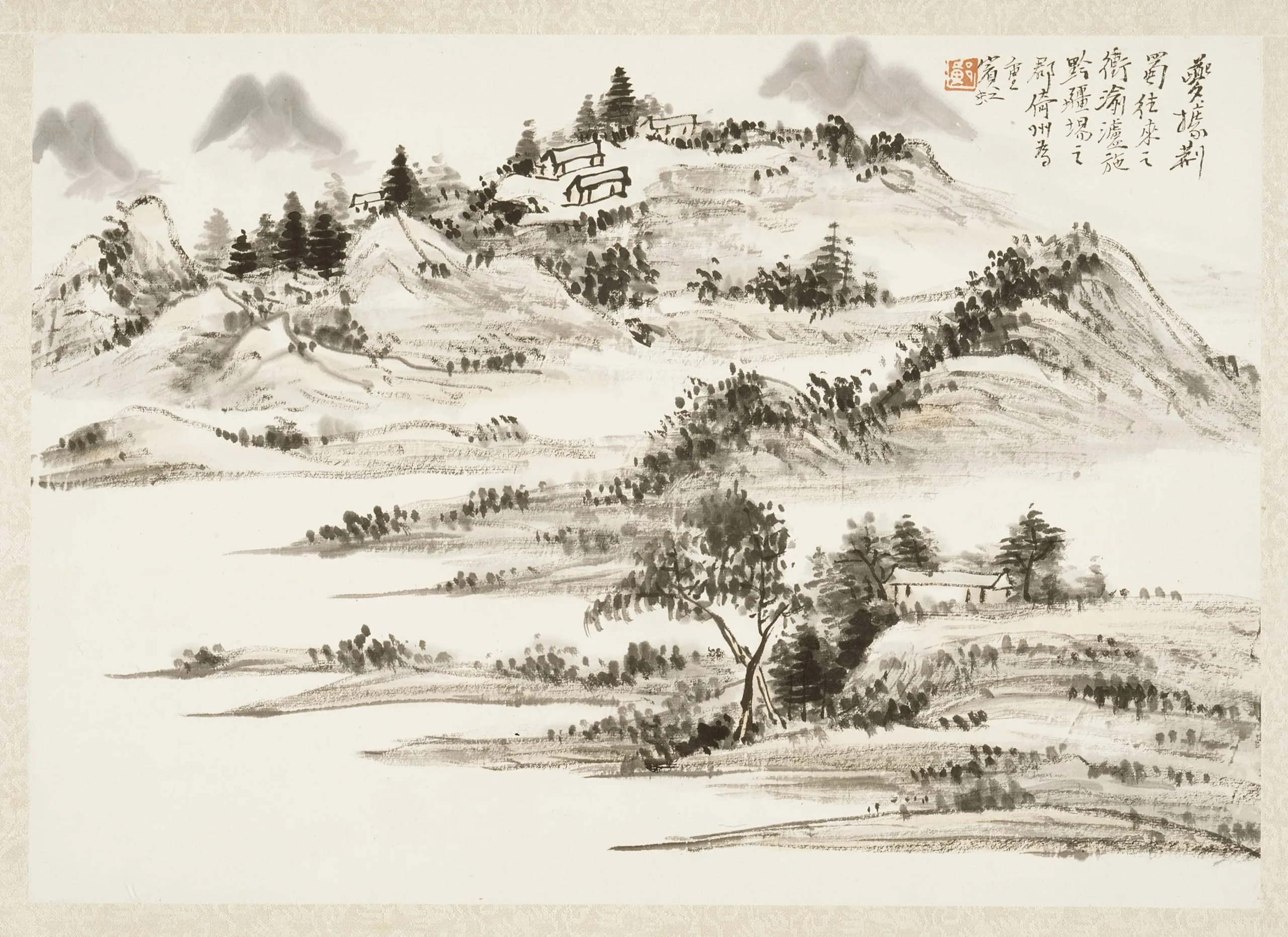 Horizontal ink wash painting of a rolling hillside landscape with conifers, terraced slopes, rooftop structures, a calm river, and a vertical Chinese inscription with red seals