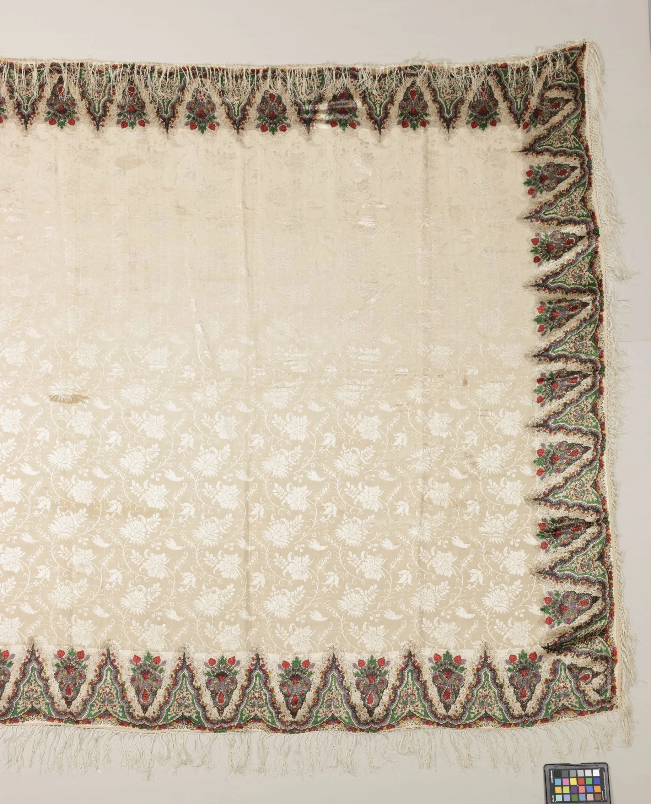 - Silk and linen plain weave with warp patterning, printed, and silk fringe
