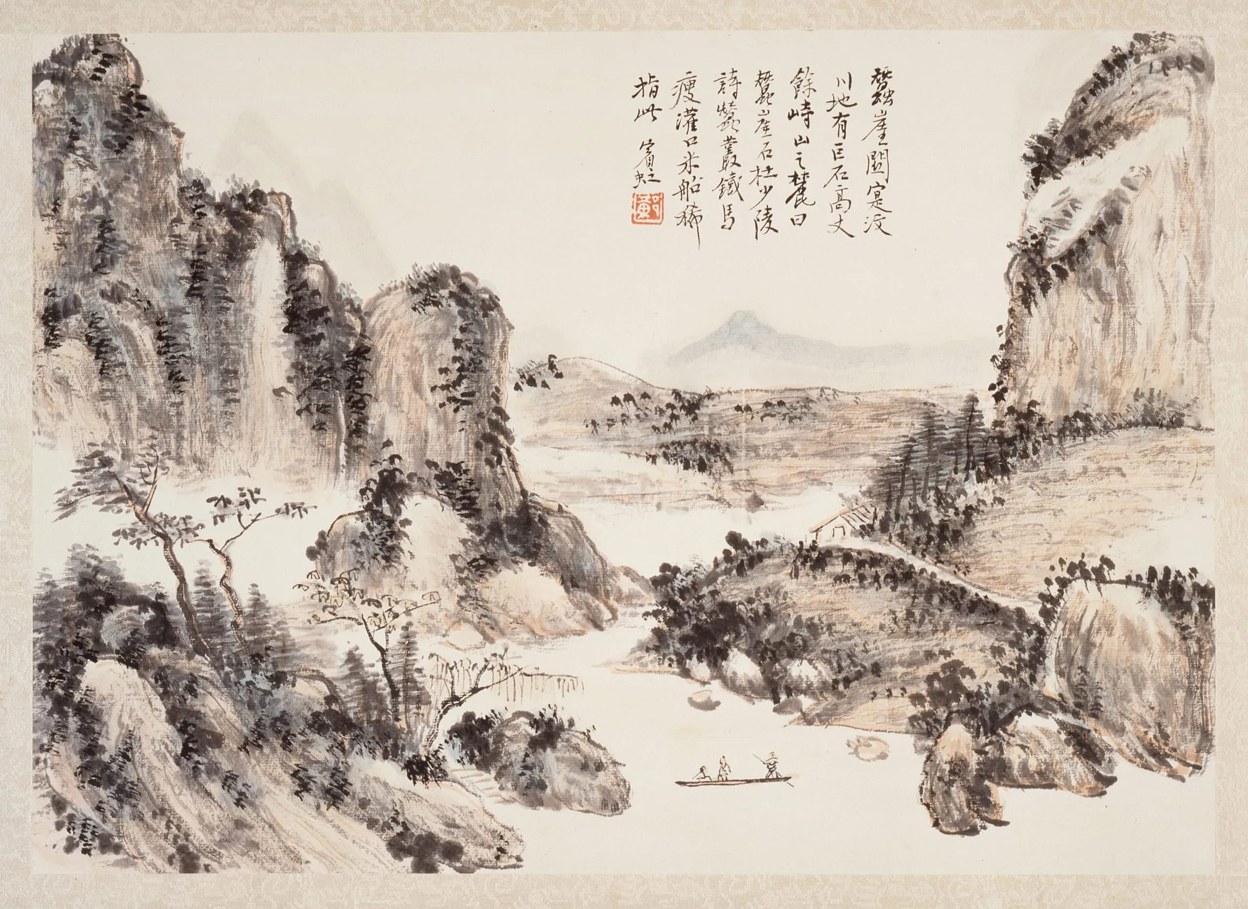 Ink and light color landscape painting, mountain cliffs and winding river valley with tiny figures in a boat, Chinese inscriptions and red seals