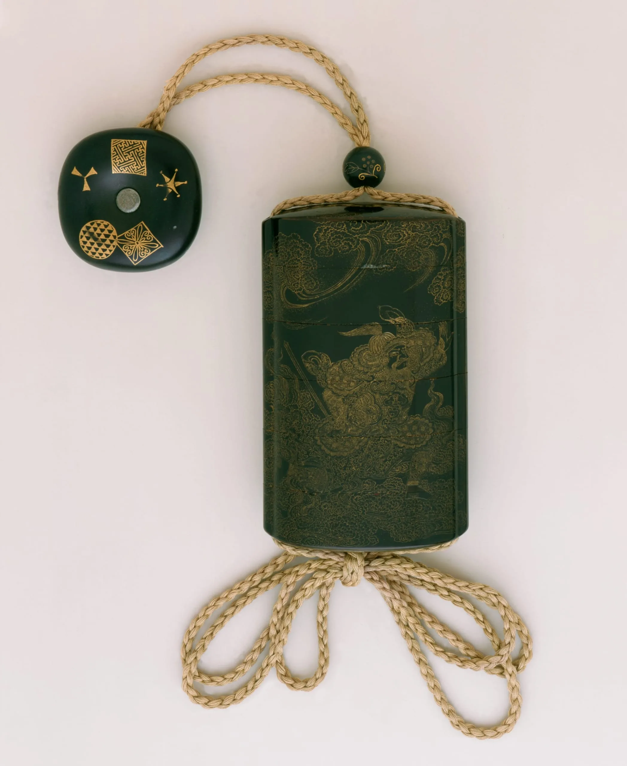- [inrō] Chinkinbori lacquer on black ground; [ojime] mixed metals; [netsuke] wood