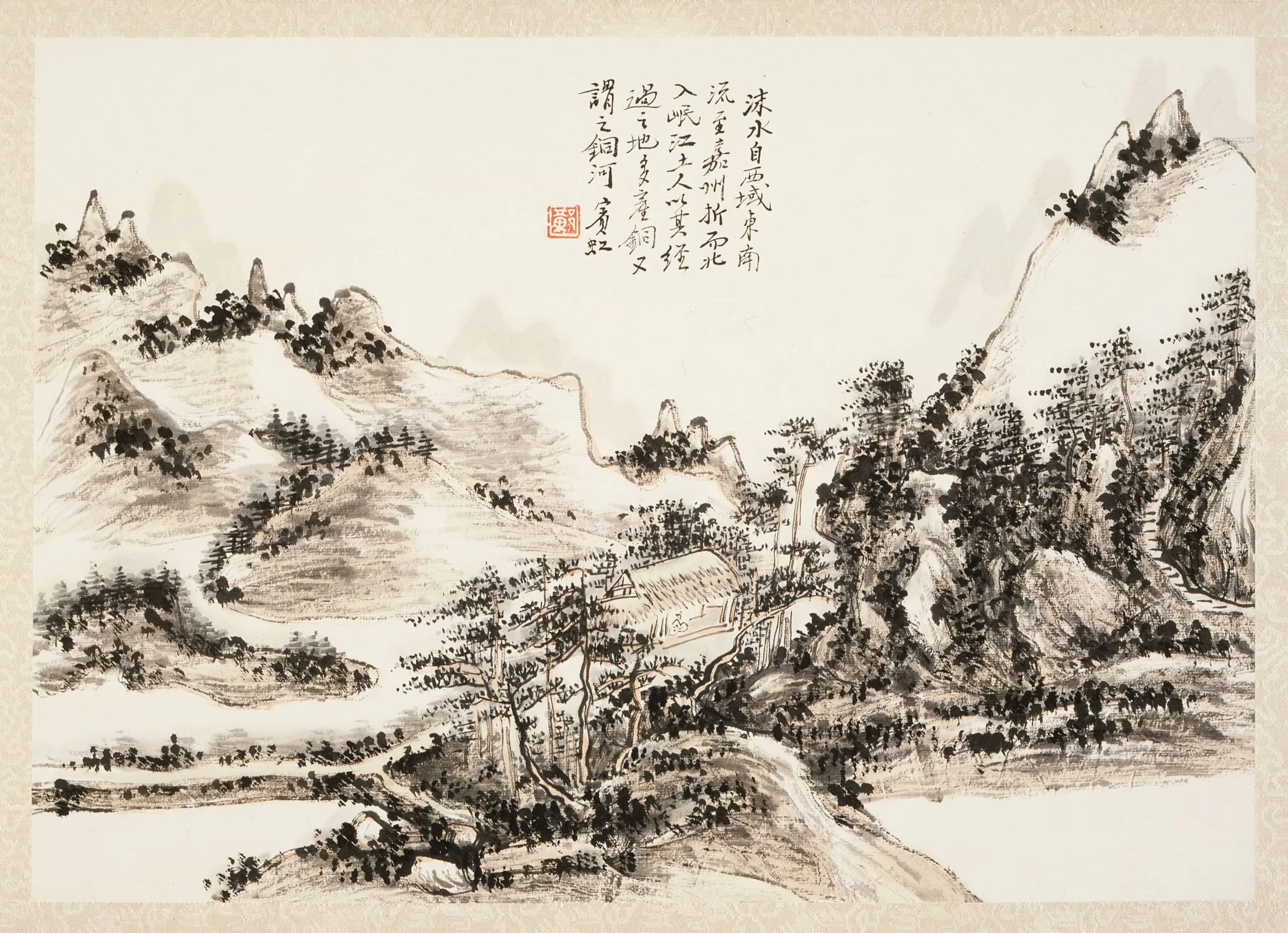 Chinese ink landscape painting on cream paper, with mountains, winding river, pine trees, and a small walled compound, with vertical Chinese text and a red seal in the upper right