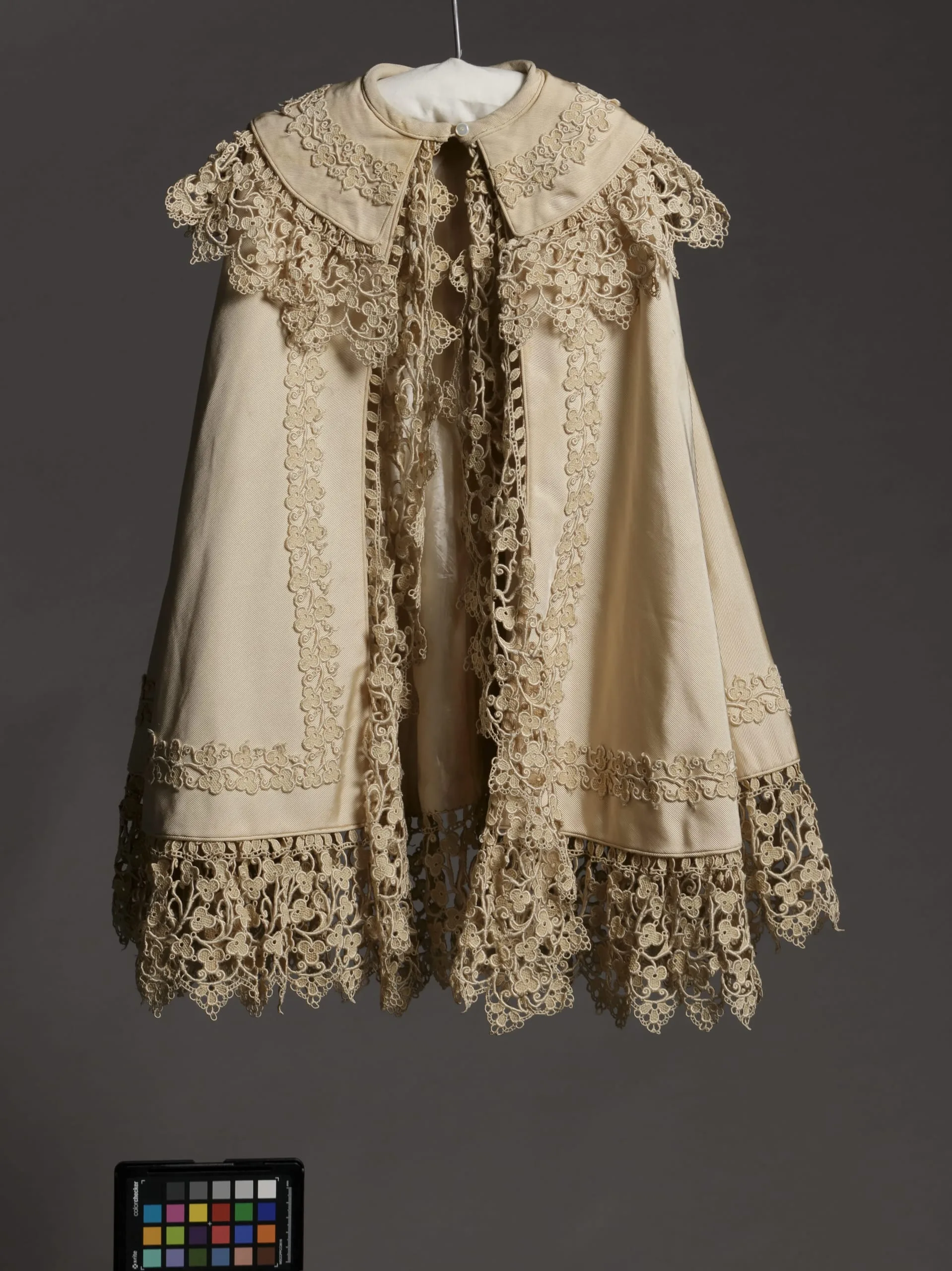 - Silk plain weave (faille), with silk, wool, and cotton lace embroidery, and mother-of-pearl buttons