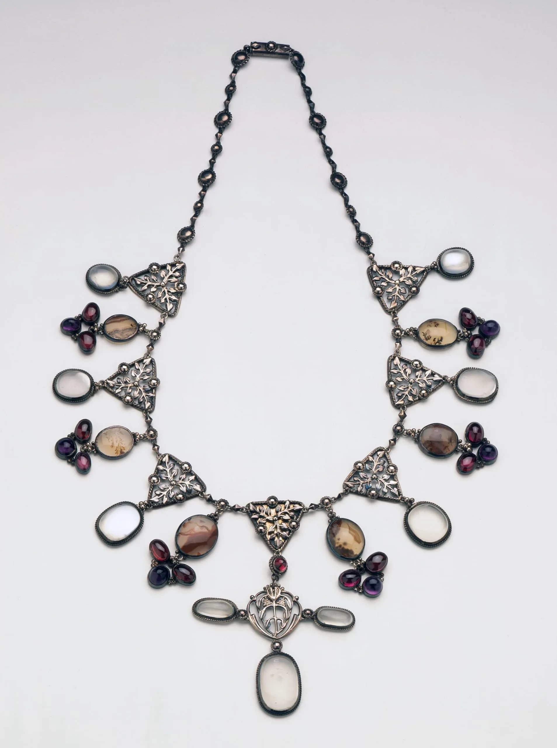 - Silver, moonstone, moss agate, garnet, amethyst, enamel, and silver wire