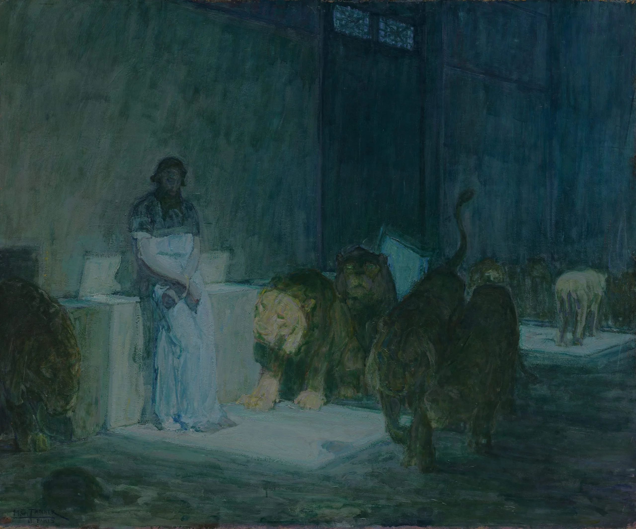 During the first decade of this century Tanner developed a poetic style in which he used color and light to evoke the essence of a religious story. In the museum’s painting Daniel appears calm, strengthened by his inner spiritual belief, and Tanner’s use of a bluegreen palette heightened this meditative mood. Experiments with pigments and glazing begun around 1907 enabled him to infuse his art with a soft, glowing light and shimmering color. While the overall color scheme of Daniel in the Lions’ Den is tonal -- typical of Tanner’s mature canvases -- the painting actually is much more varied in color than it initially appears, for the lions are sketched in brilliant shades of yellow, green, and lavender.