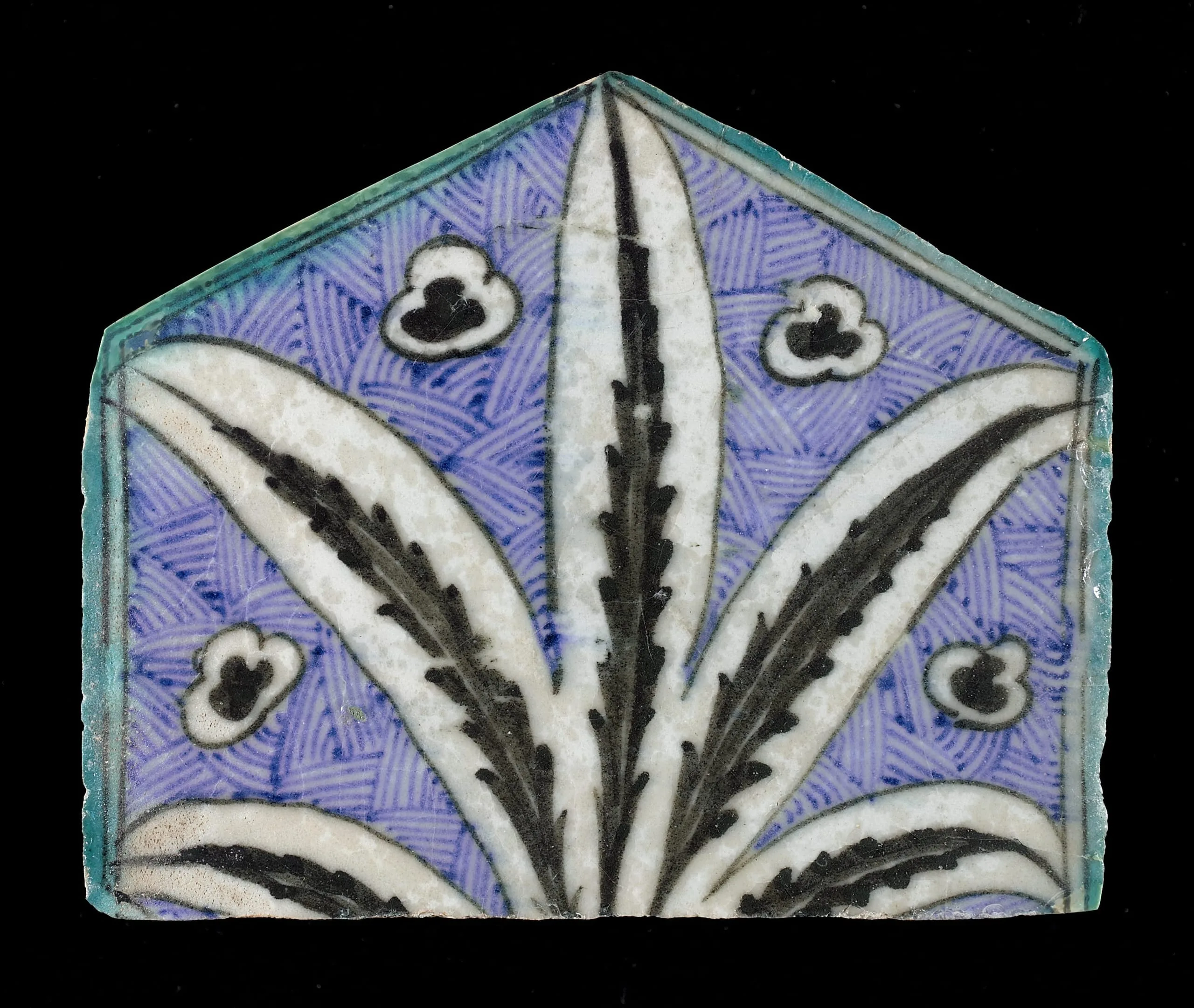Pentagon-shaped ceramic tile with turquoise border, periwinkle blue crosshatched ground, a fanlike spray of serrated white-and-black leaves, and small trefoil cloud motifs