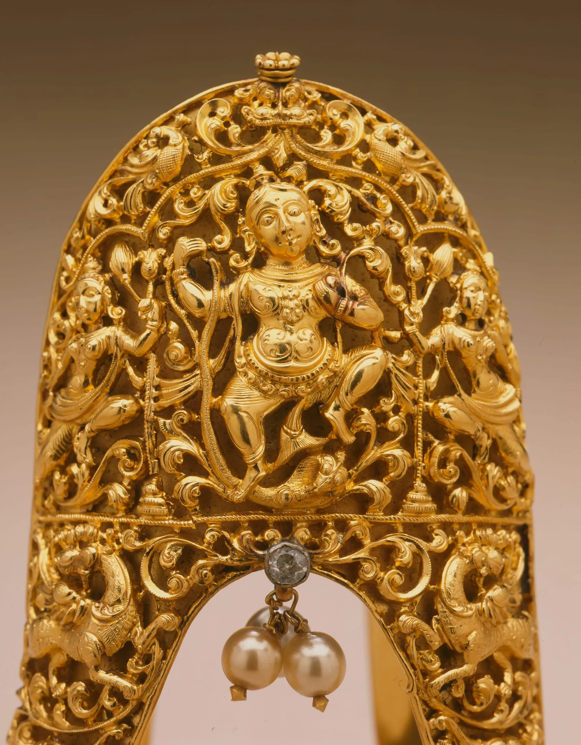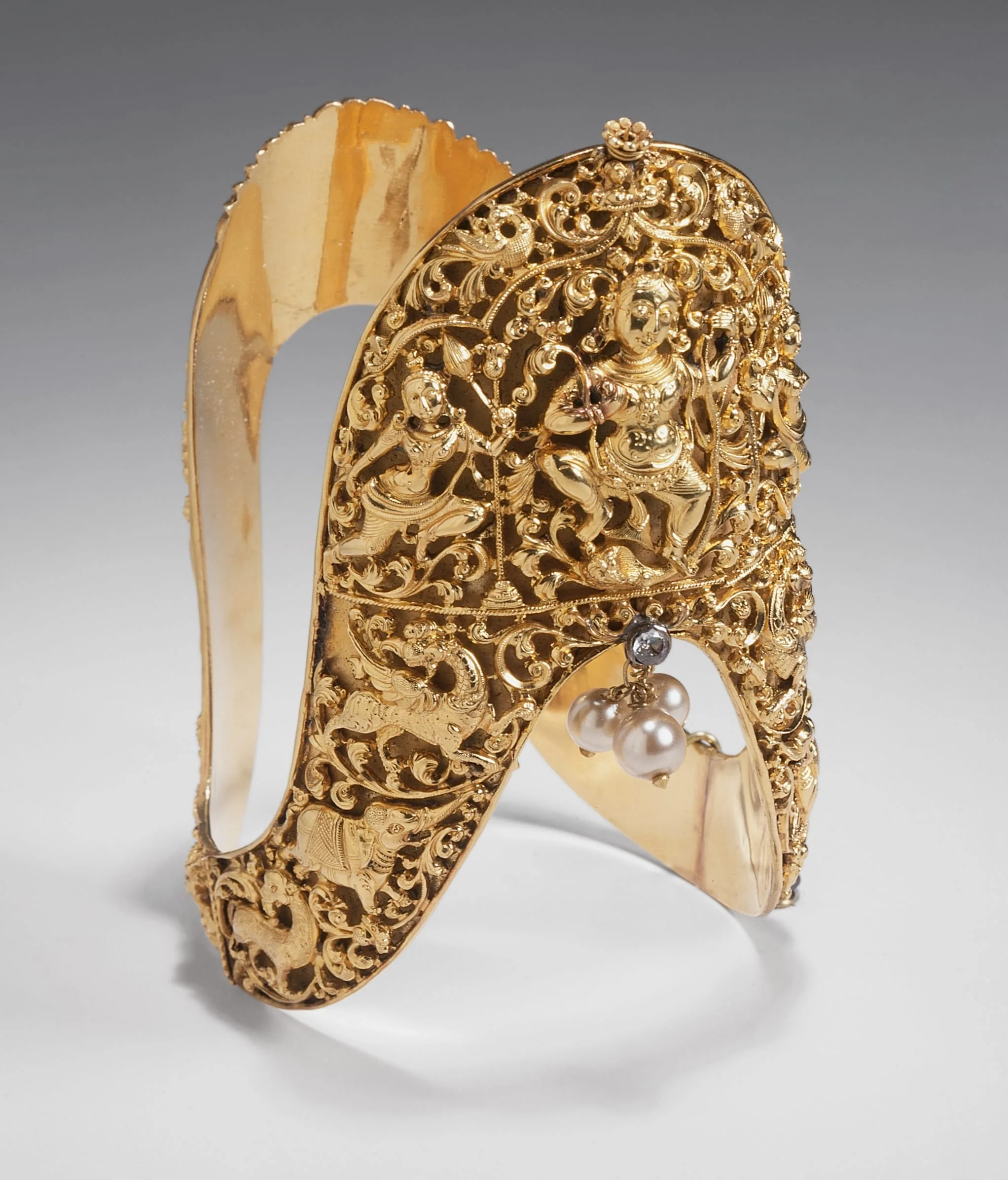 Distinguished by its intricate workmanship, this extraordinary armlet (vanki) is made of repoussé and chased gold, opalescent glass beads, and an inset gray topaz. Attributed to Chennai, circa 1850–1900, it epitomizes a traditional type of ornament worn by southern Indian Hindu women on their upper arms. The armlet features delicate openwork panels of micro-repoussé and chased gold filigree images of human, animal, and mythological figures. They are set in horizontal registers defined by arches with pearl borders for the primary figural row and, for the subsidiary figures, amidst a lace-like background of scrolling vines. Plain sheet gold is used as the support backing for the figural matrix.