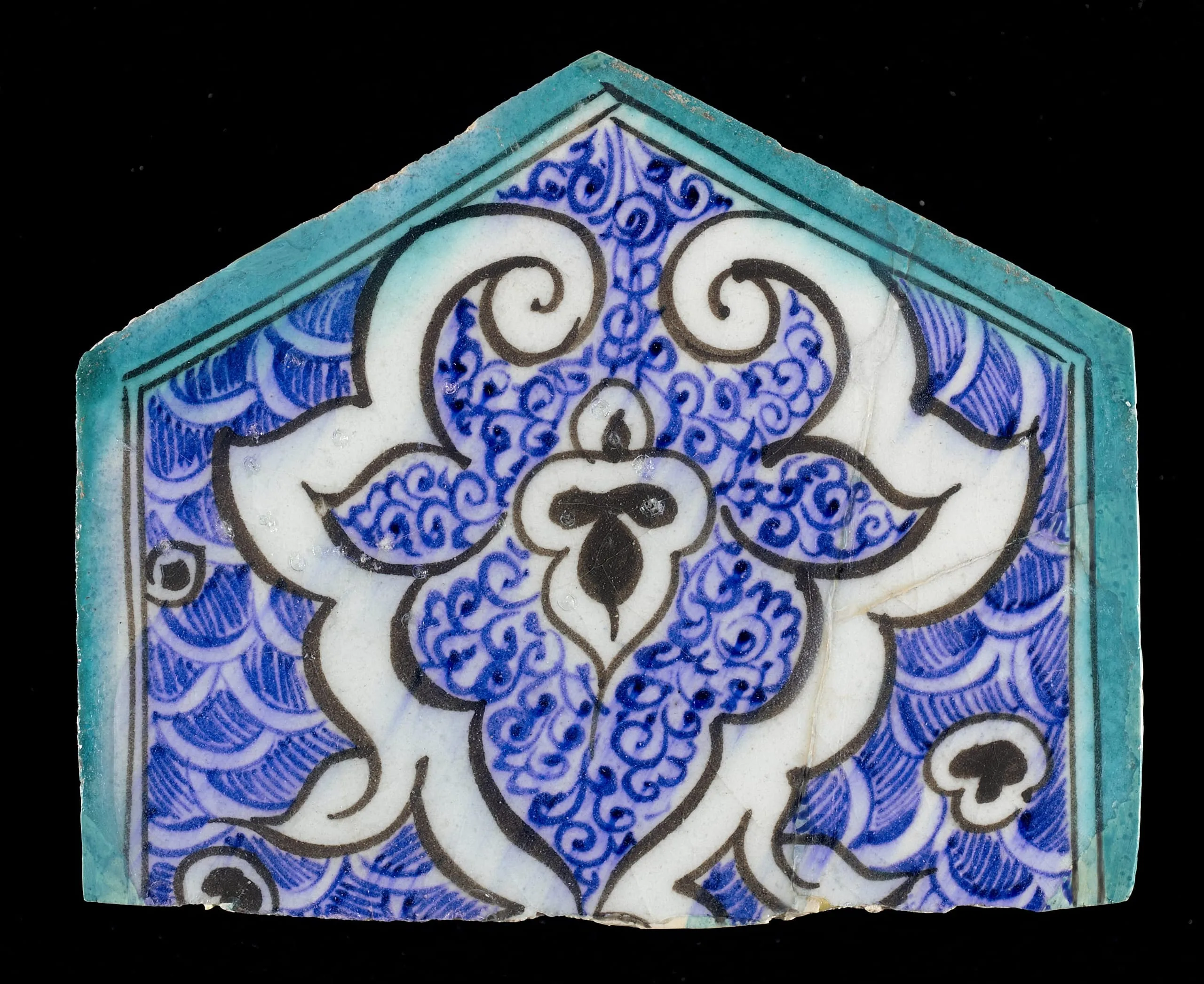 Pentagonal ceramic tile with cobalt blue and white glaze, featuring a central four-lobed white medallion over a dense wave-pattern ground with scrolling tendrils, turquoise border