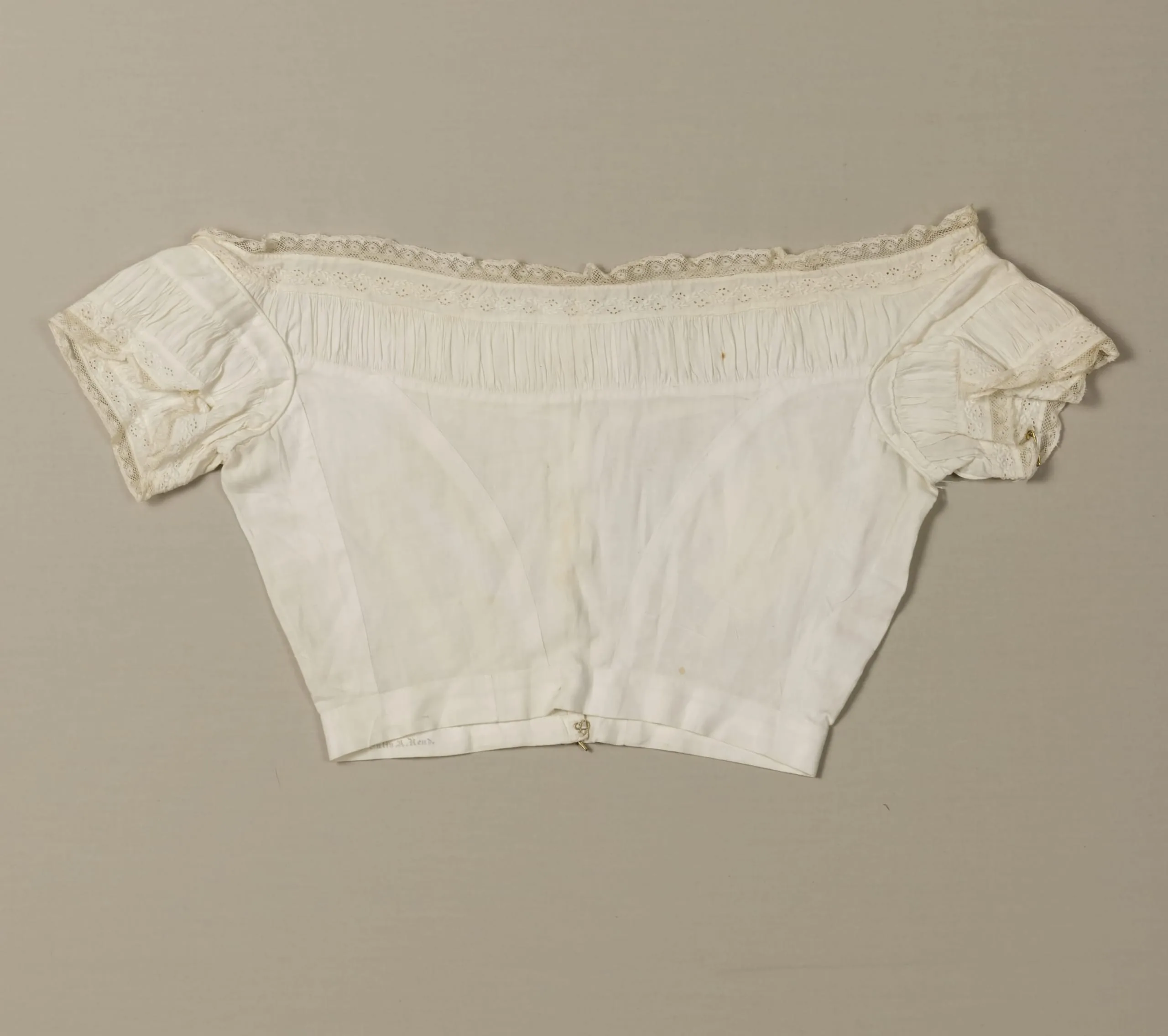 - Cotton plain weave with cotton cutwork embroidery (broderie anglaise) and linen lace