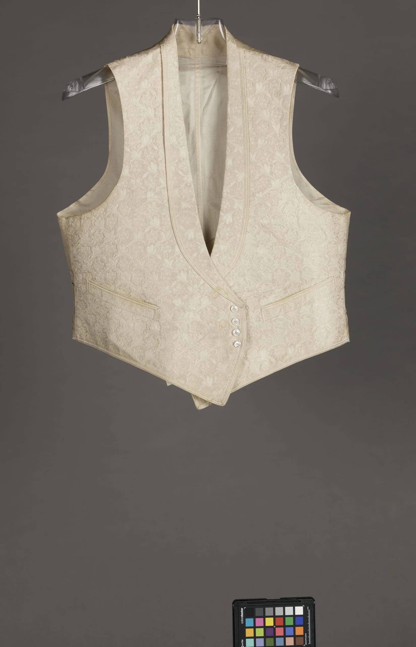 - Silk plain weave with silk supplementary-warp and -weft patterning, silk braid trim, and mother-of-pearl buttons