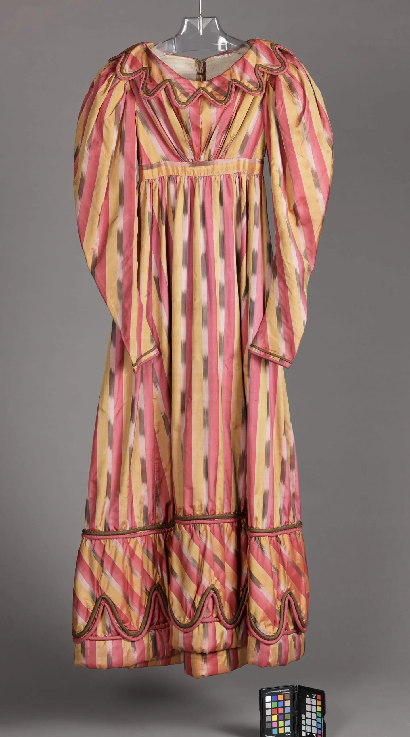 Full-length historical dress in ikat-woven fabric with pink, yellow, and gray vertical stripes, puffed sleeves, high waistline, scalloped collar, and diagonal-striped hem band trimmed with dark cord
