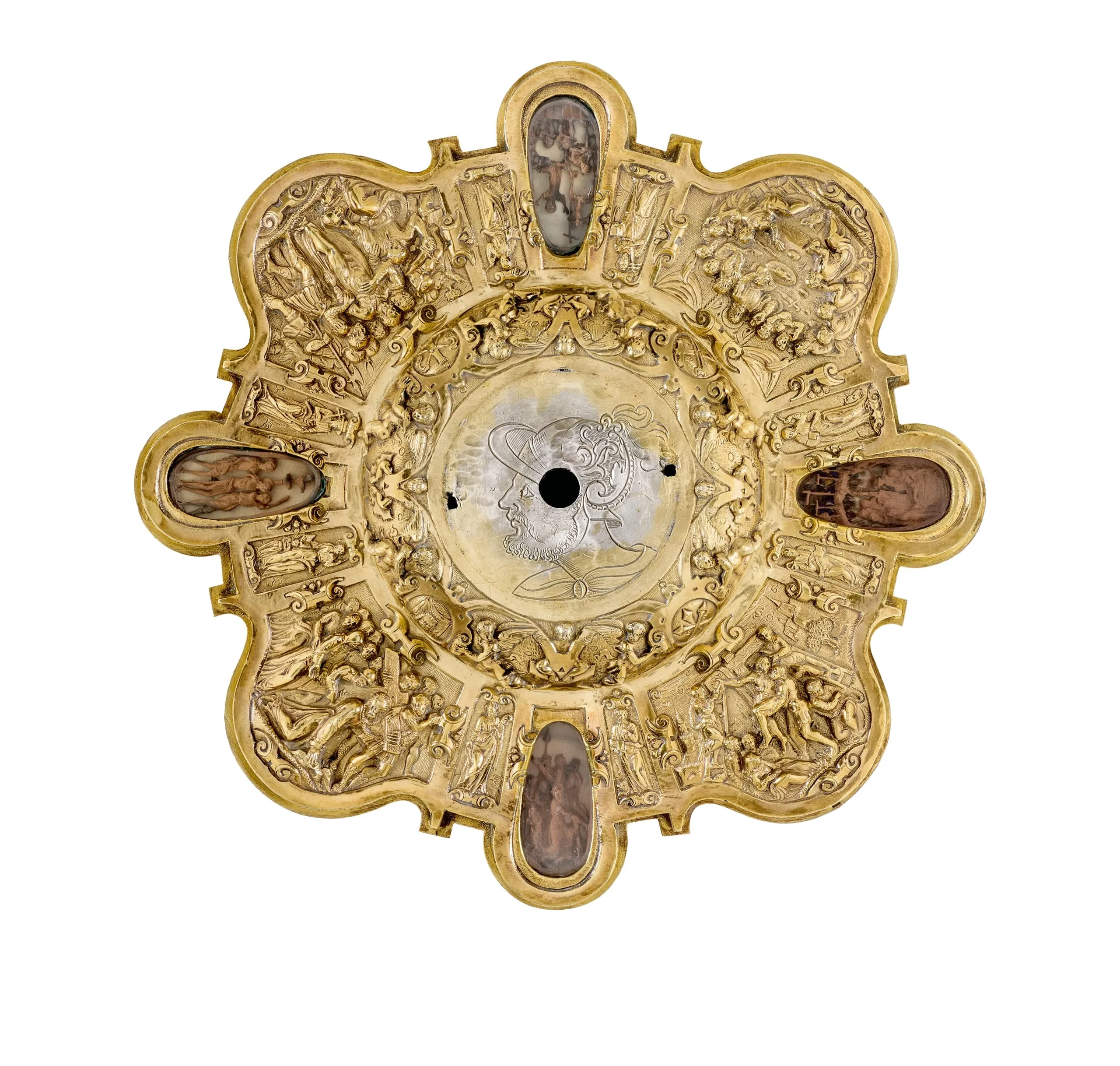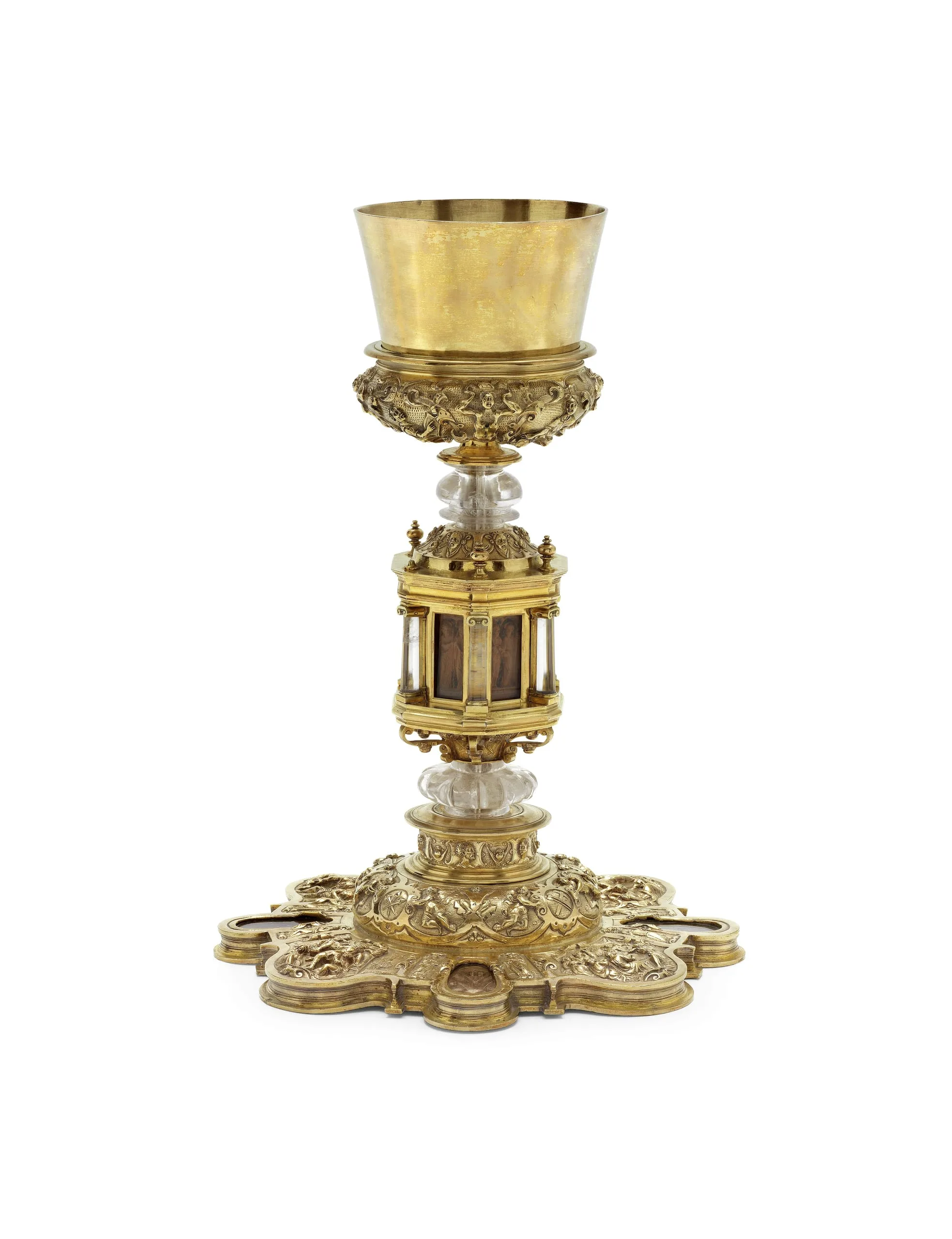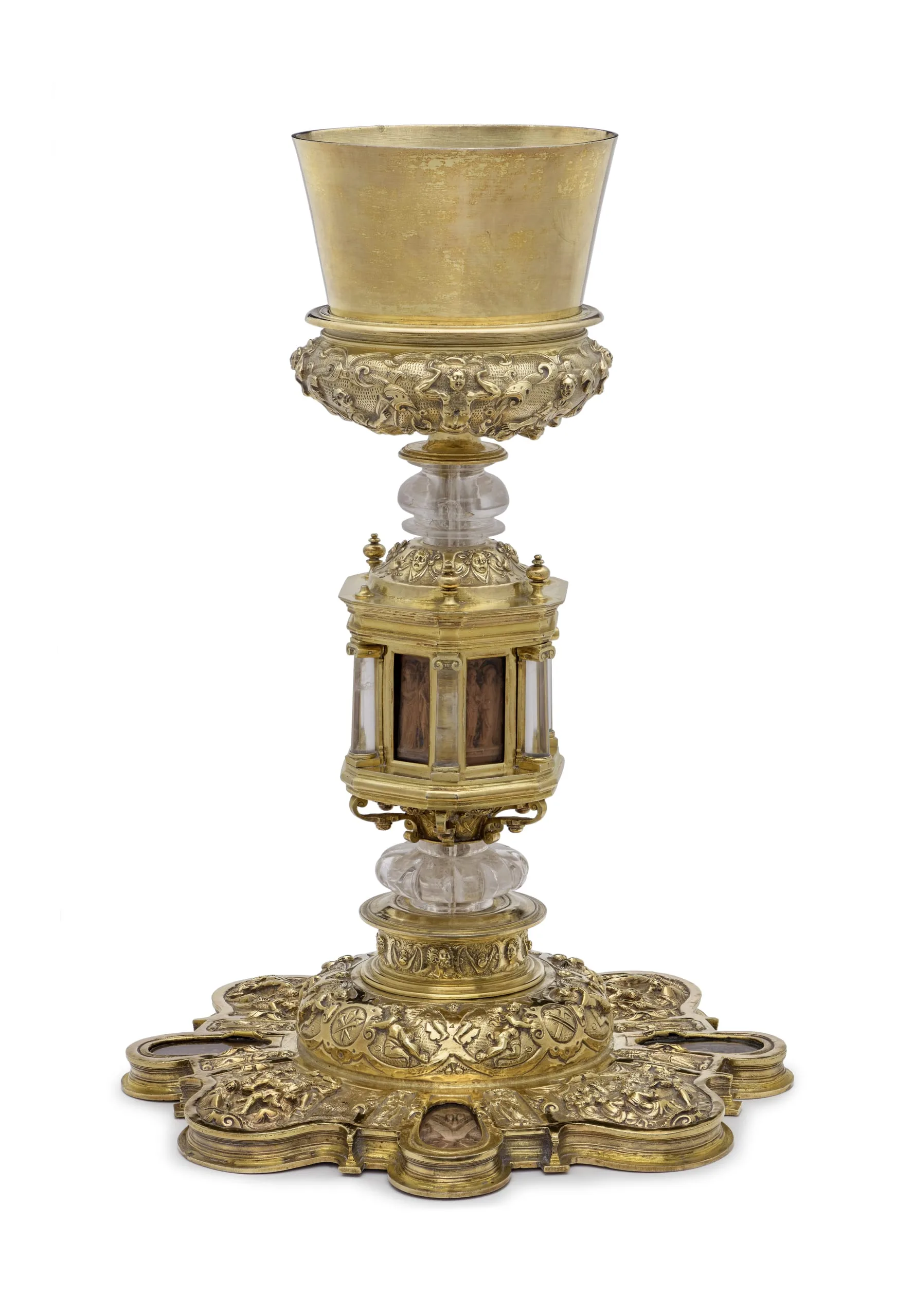Combining precious metals, feathers, boxwood carvings, and rock crystal, the “Hearst Chalice” stands out as one of the most complex works of sixteenth-century Mexican silversmithing. Used in ancient times and invested with sacred meaning, these materials were redeployed to create Christian objects, demonstrating an important level of agency for Native artists as they staked their place in the new body politic. Although mostly deteriorated, the feathers would have glistened with ambient light and motion, helping channel the spirit of the divine.