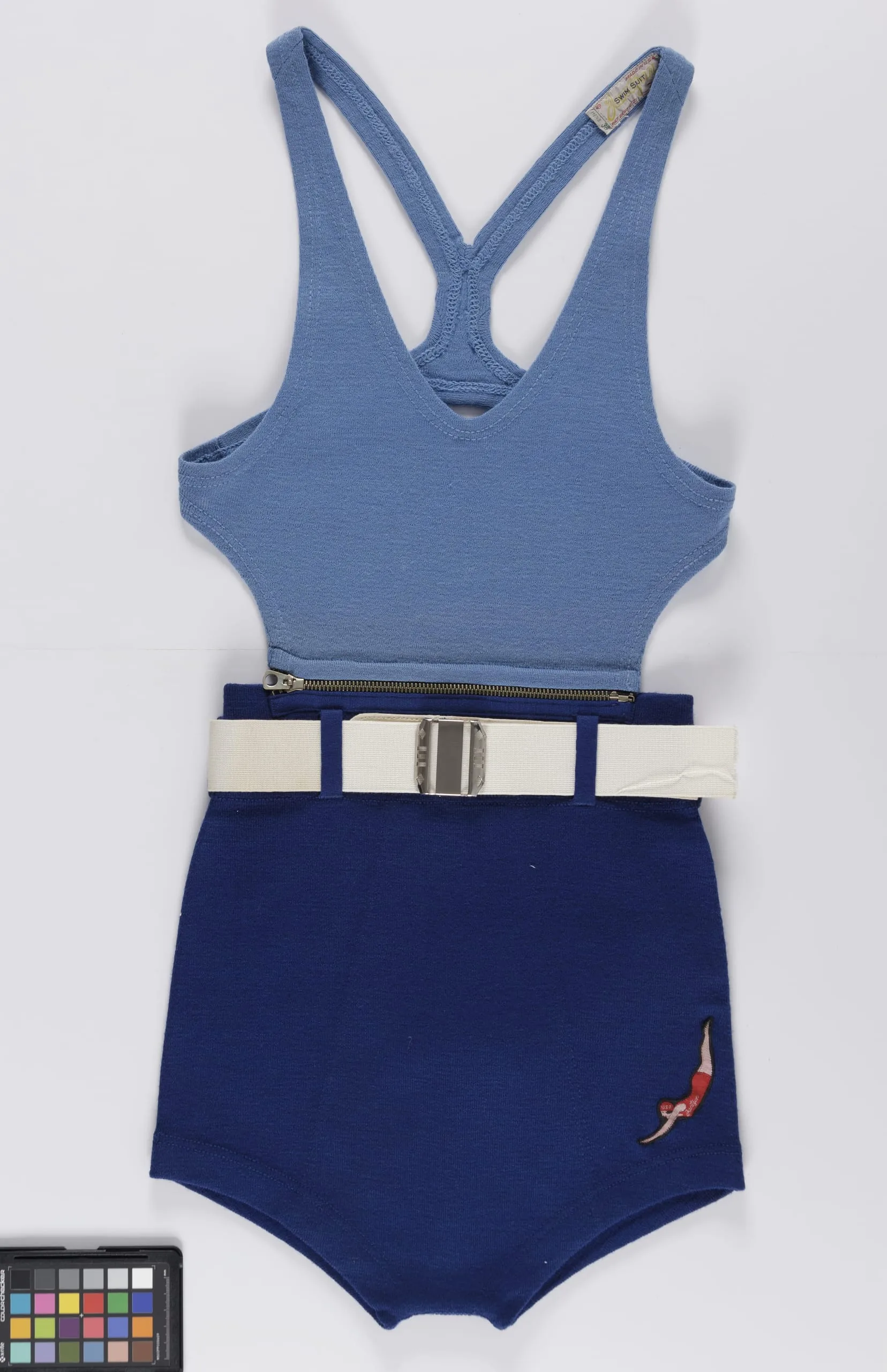 - Trunks: wool knit with metal; Top: wool knit with metal; Belt: cotton braid (webbing) and metal