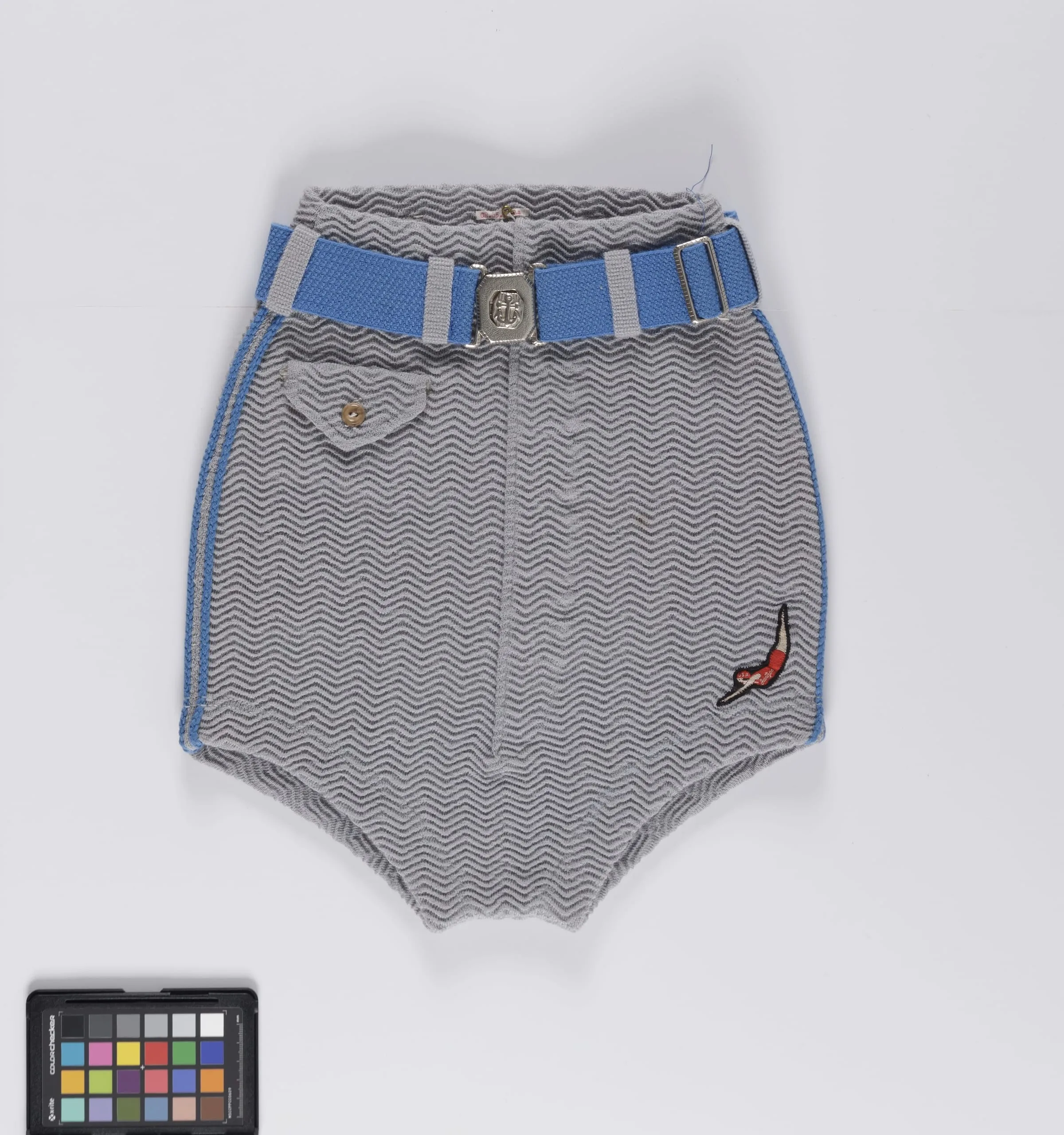 - Trunks: wool and elastic knit with wool braid trim; Belt: wool and elastic braid (webbing) with metal