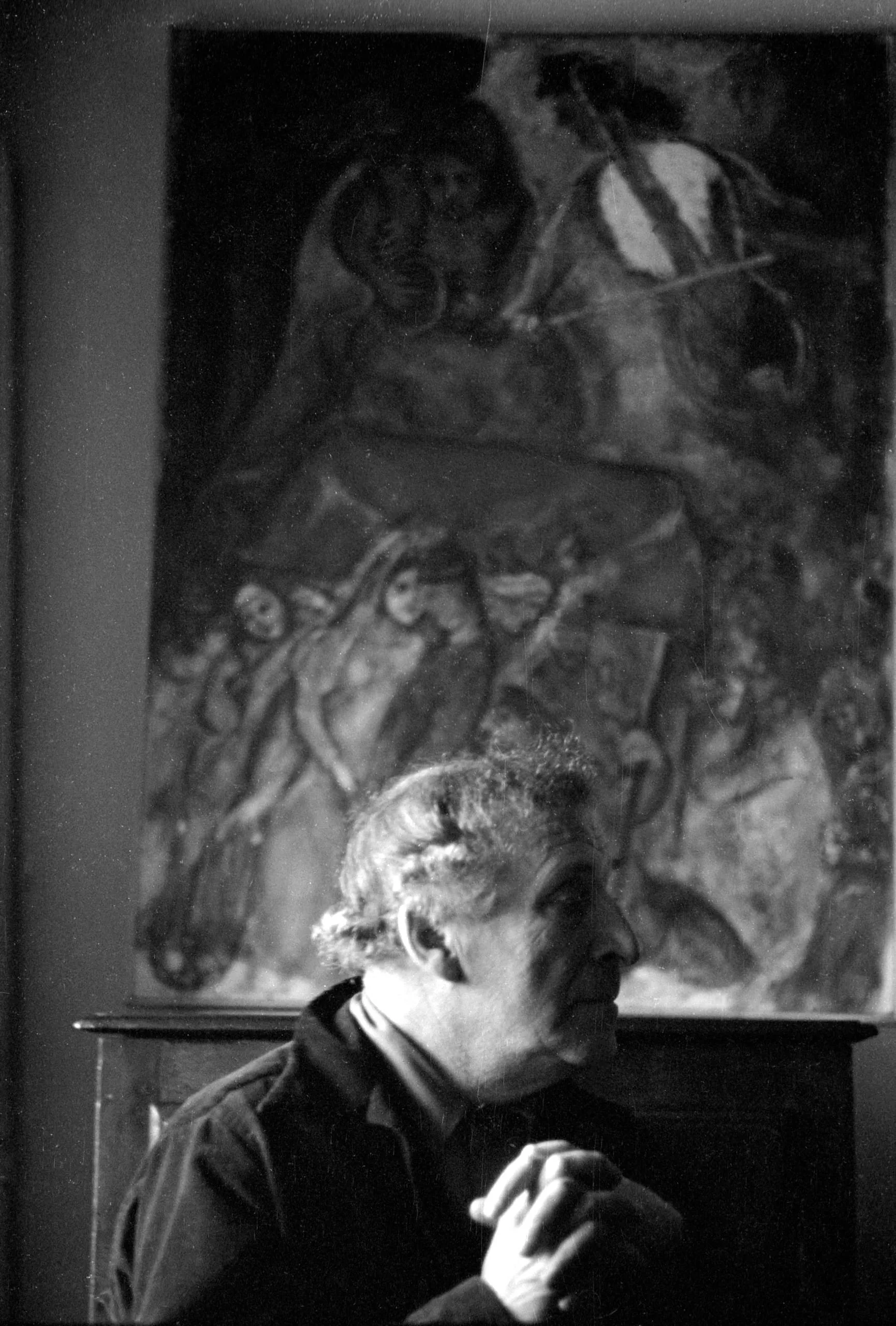 Black and white photograph, a man with curly gray hair in profile, seated before a large figurative painting with loosely rendered figures, strong directional lighting