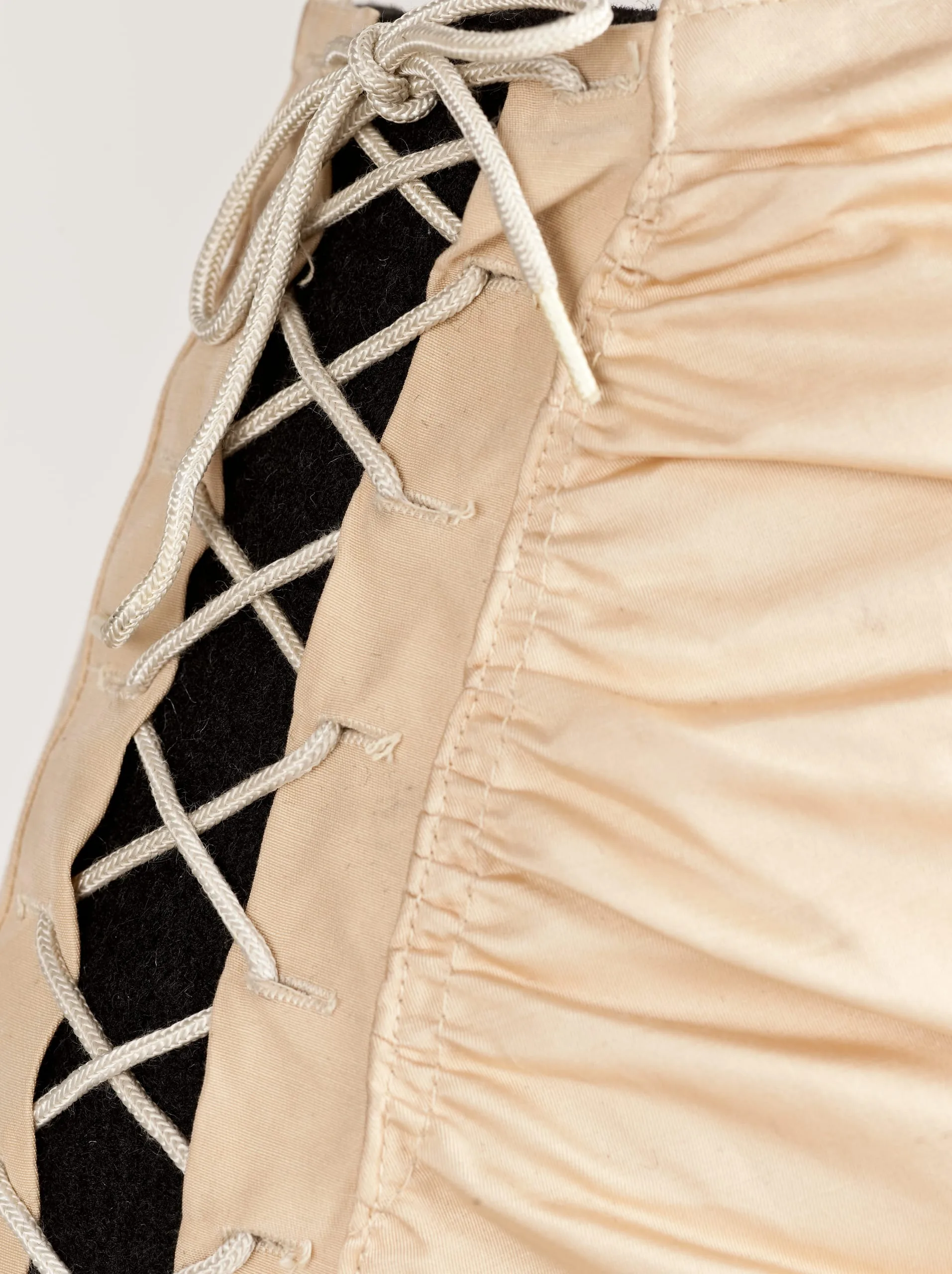 To conform to federal government restrictions on rubber consumption during World War II, the Swoon Suit—so named to suggest the appropriate male reaction to a woman wearing it—was designed to fit the figure with adjustable ties and side laces without using elastic. Cole of California’s factories manufactured parachutes for soldiers as well as making swimwear, and the firm advertised its patriotic response to wartime necessity in trade and popular magazines. This swimsuit’s most popular color was “Parachute White.”