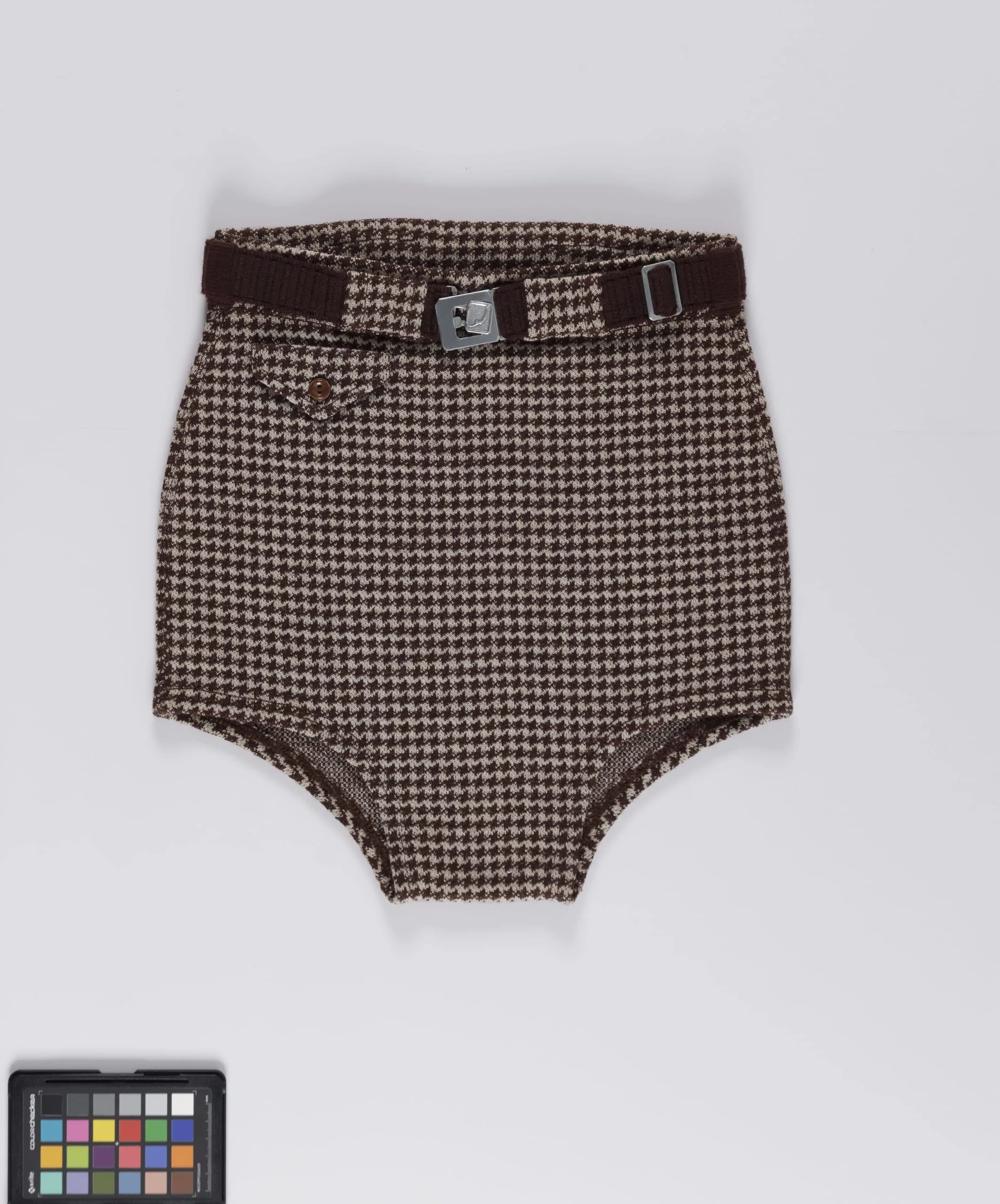 - Wool knit, with cotton/rayon ribbon and metal buckles