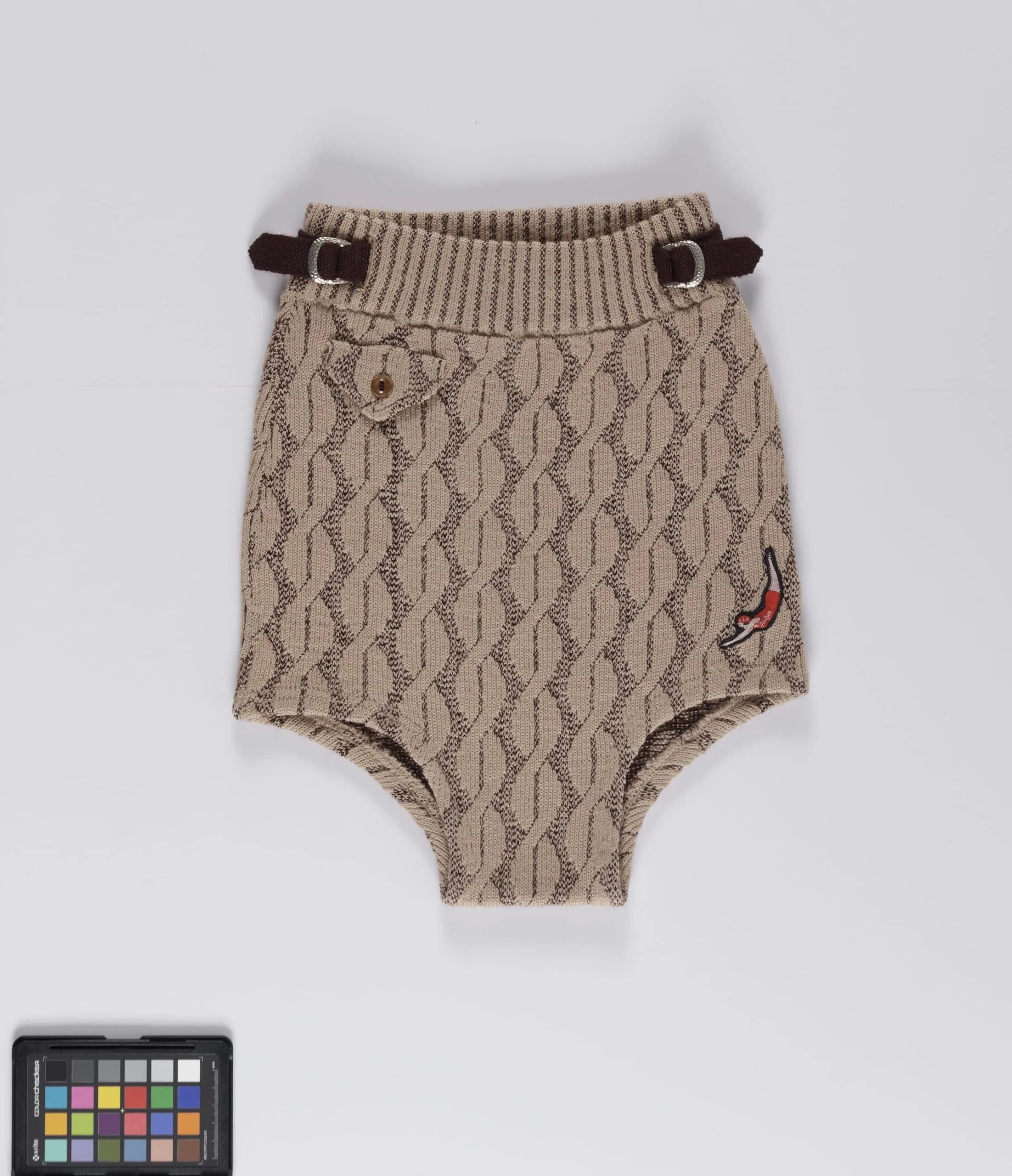 - Wool/Lastex knit, cotton/rayon straps, with metal buckles