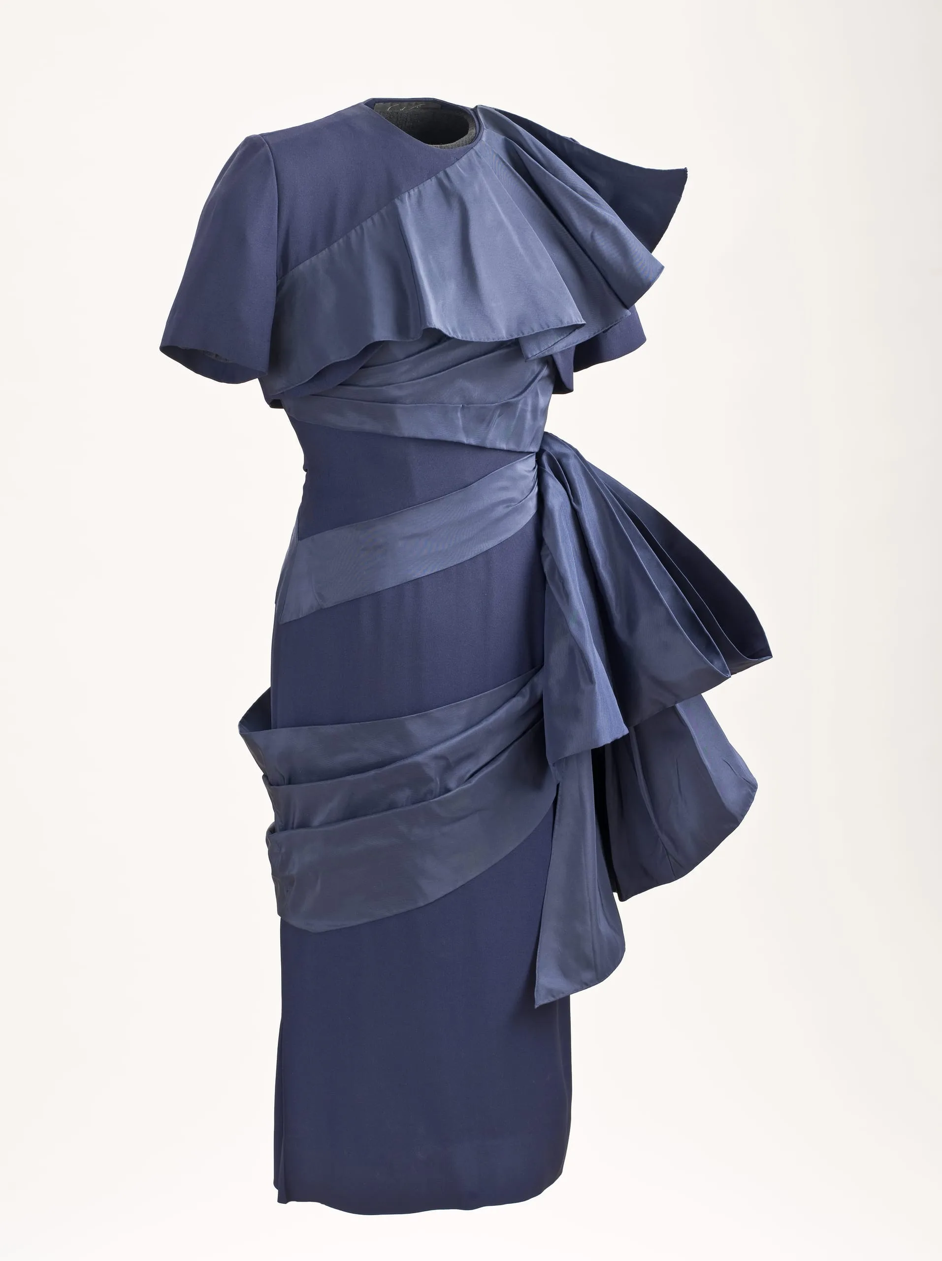 As the head costume designer for MGM (Metro-Goldwyn-Meyer) from 1928 to 1941, Adrian used dramatic proportions, luxurious materials, elegance, and wit, qualities for which he became renowned. His later work in high fashion exhibited this enduring signature style: in a collection ironically titled The Atomic 50s, Adrian featured textile swags and projectiles evoking mushroom clouds, as well as flounces that blasted off the garment’s surface.