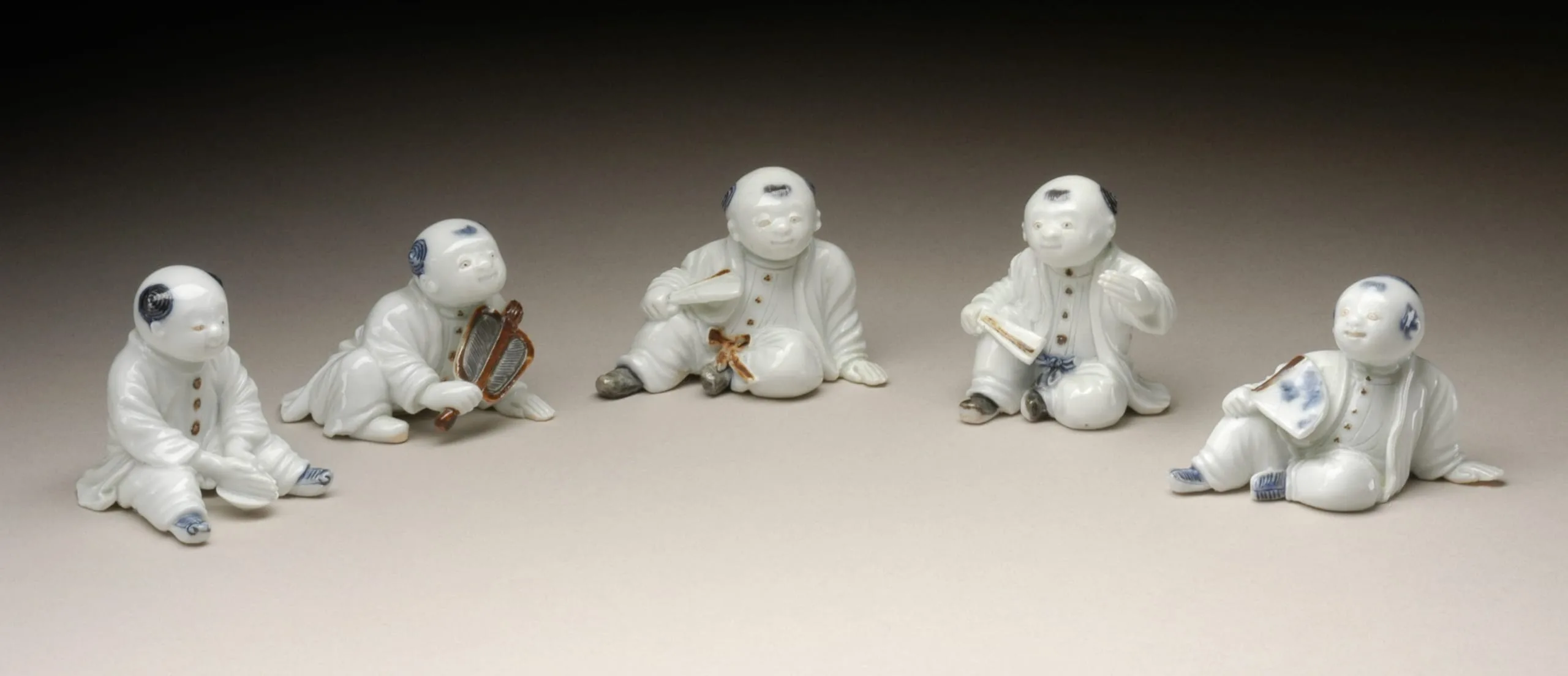 - a) Boy with flat fan: 1 1/2 x 1 5/8 x 2 in. (3.81 x 4.13 x 5.08 cm); b) Boy with closed fan: 1 3/4 x 1 5/8 x 1 3/4 in. (4.45 x 4.13 x 4.45 cm); c) Boy with spinning top: 1 3/4 x 1 1/2 x 1 15/16 in. (4.45 x 3.81 x 4.92 cm); d) Reclining boy with closed fan: 1 1/2 x 2 1/4 x 1 1/2 in. (3.81 x 5.72 x 3.81 cm); e) Boy with open fan: 1 1/2 x 2 1/2 x 1 3/8 in. (3.81 x 6.35 x 3.49 cm)