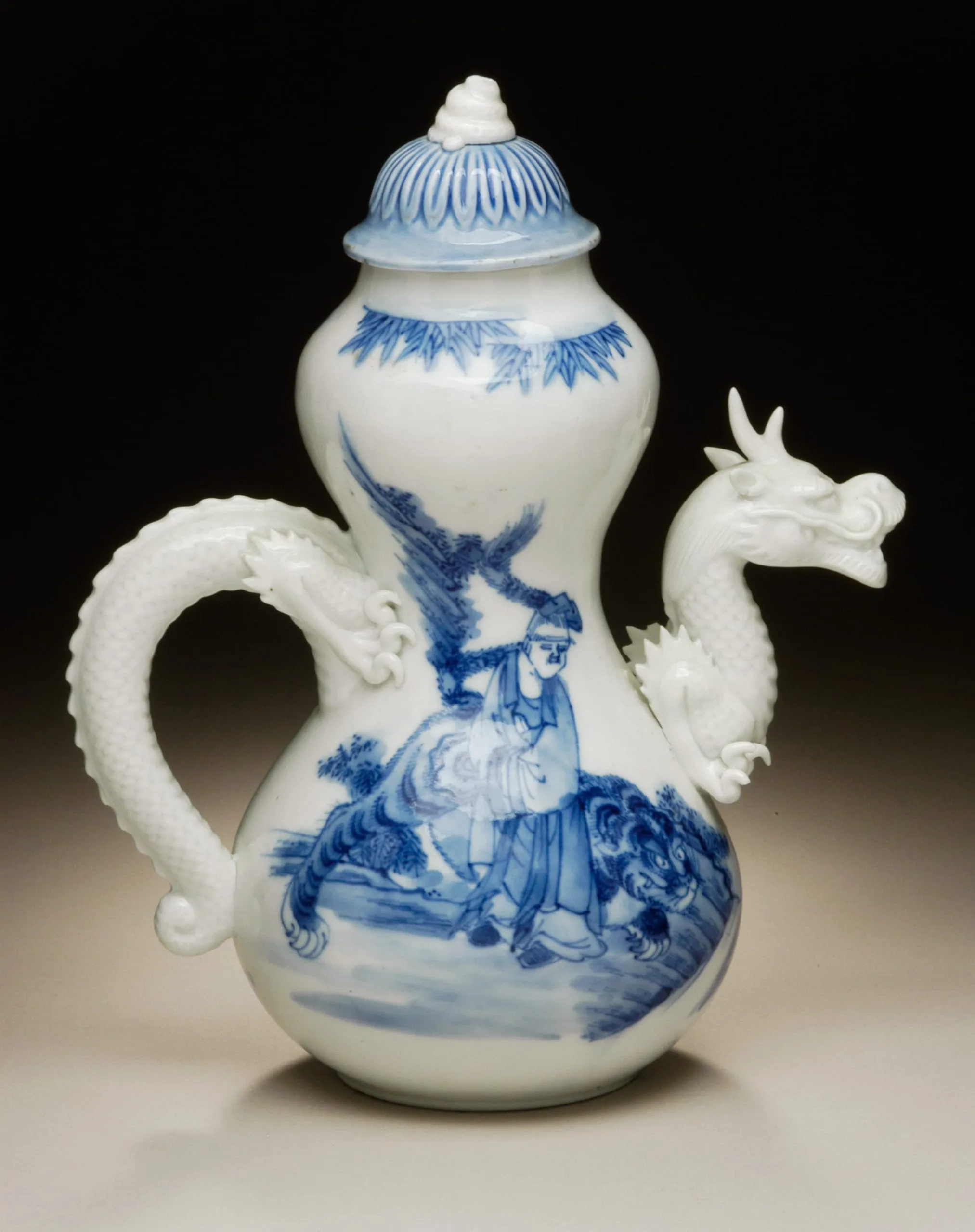 - Sake Ewer with Fenggan and Tiger Design, Dragon Handle and Spout