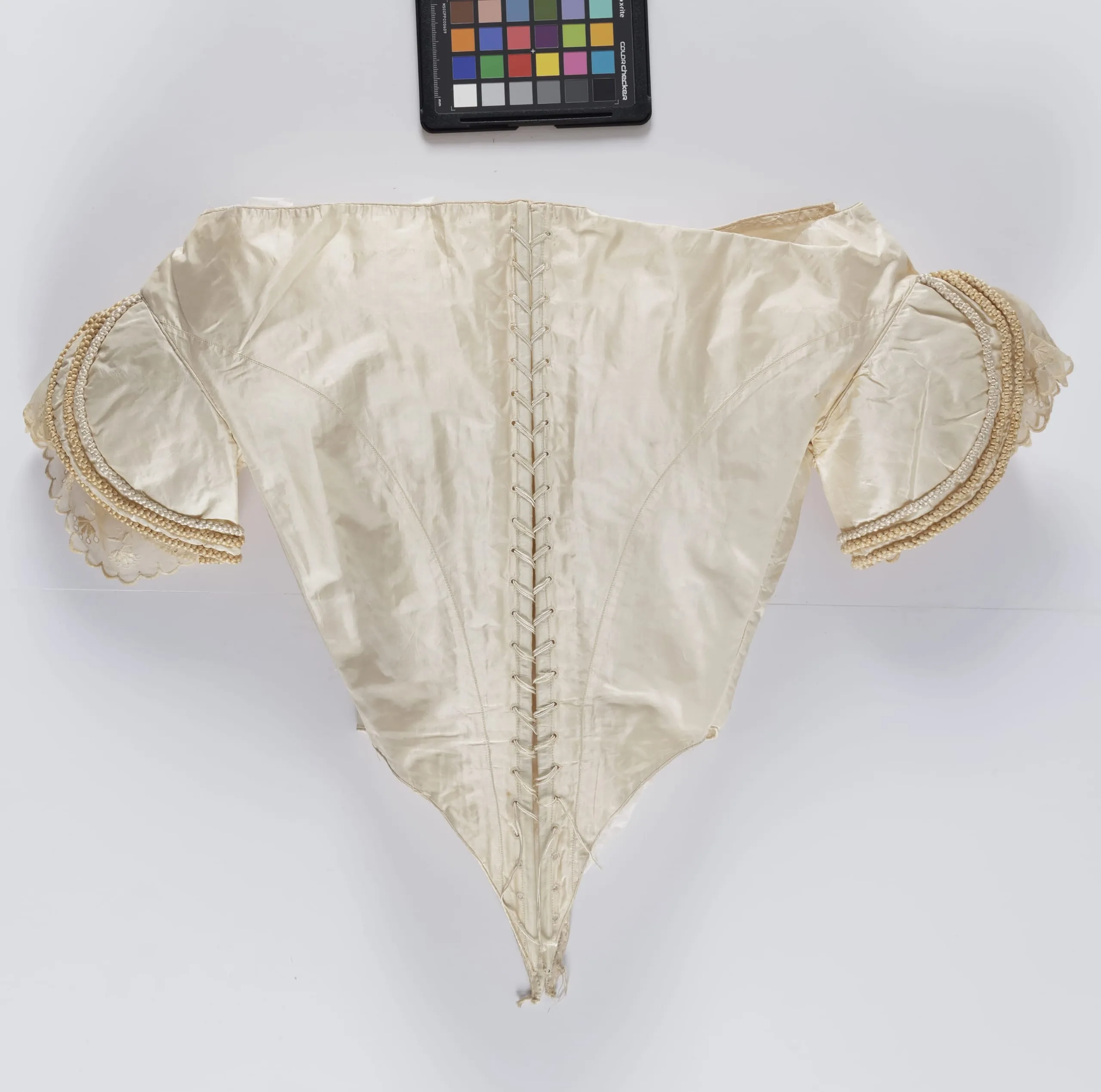 - Silk plain weave with silk cord, linen plain weave, and linen embroidery